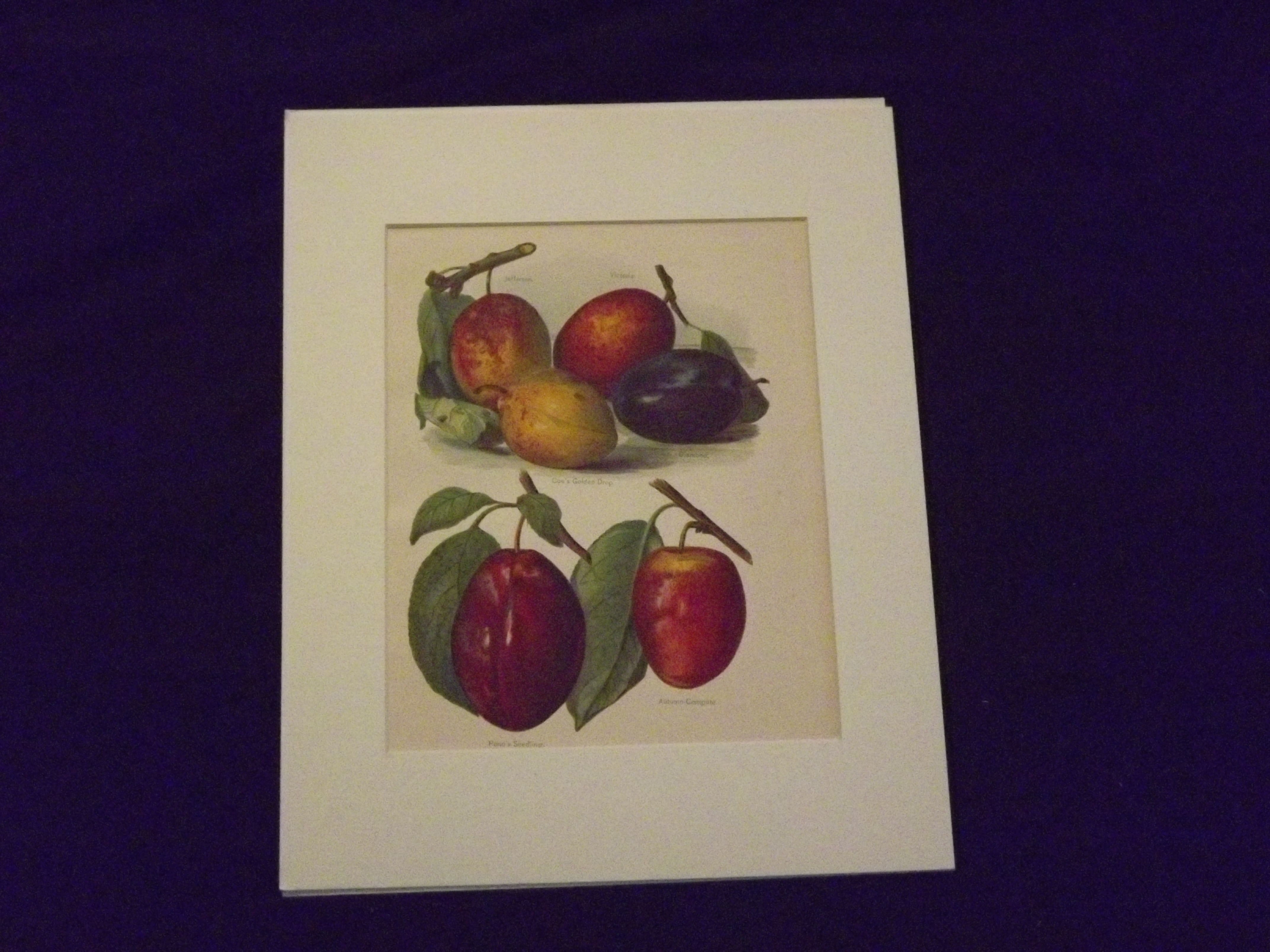 Wright, John. The Flower Grower's Guide: Plums. London: J.S. Virtue & Co, 1890s. Print, 4to, chromolithograph, colored. Slight aging and browning, right margin a little rough from extraction (no affect on image); otherwise bright and clean. This plate comes from Wright's (1836-1916) celebrated work on fruit (The Fruit Growers Guide). The beautiful plates from this work are credited to Miss Gertrude Hamilton and Marie Low. This colorful chromolithograph features several types of plums, including Pond's Seedling and Victoria, in a variety of colors. A very attractively colored print.