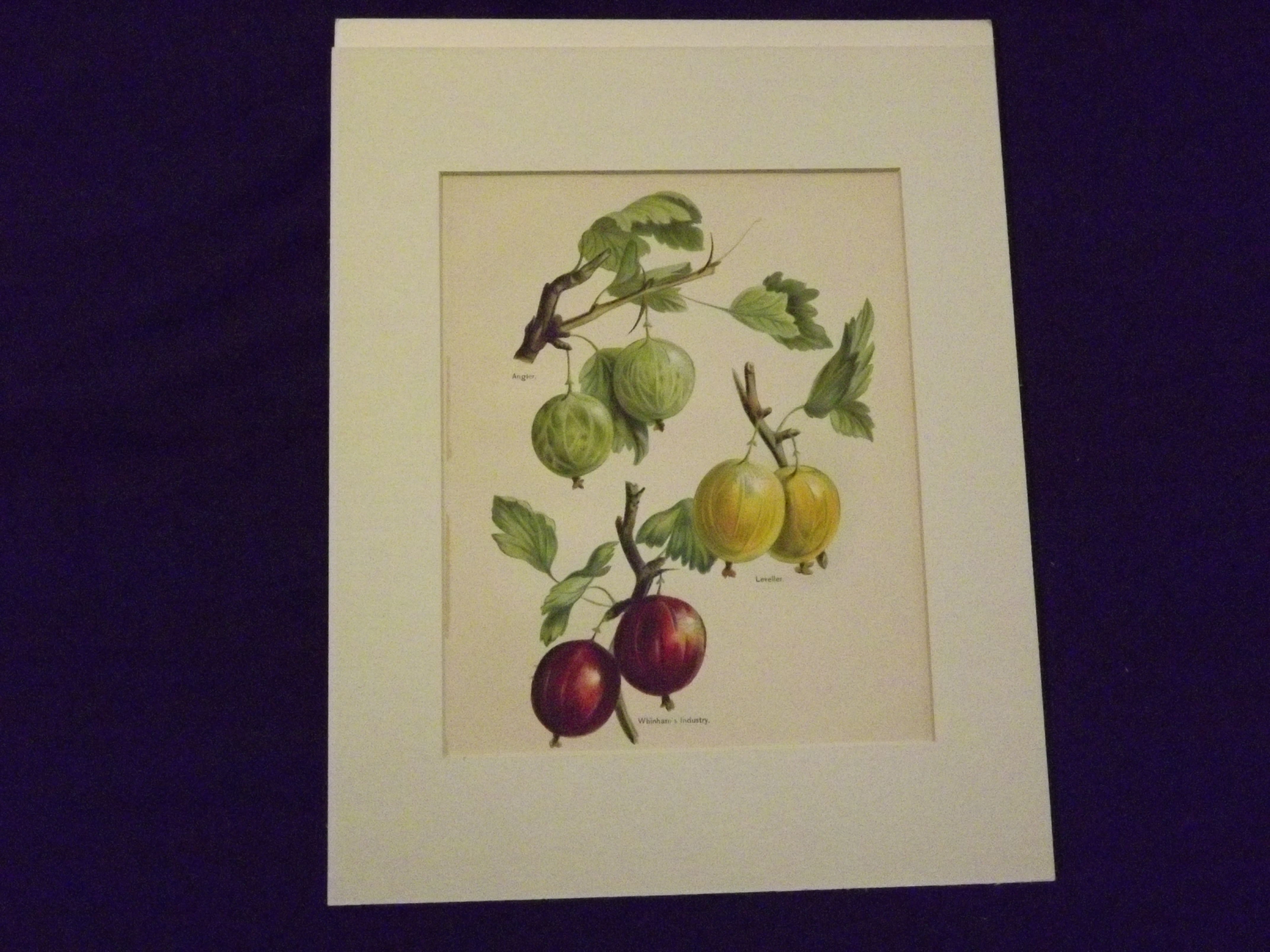 Print, 4to, chromolithograph, colored. Slight aging and browning, left margin a slightly rough from extraction (no affect on image); otherwise bright and clean. This plate comes from Wright's (1836-1916) celebrated work on fruit(The Fruit Growers Guide). The beautiful plates from this work are credited to Miss Gertrude Hamilton and Marie Low. This colorful chromolithograph features three types of gooseberries, the Angler, Whinham's Industry, and the Leveller, in a few different colors. A very attractively colored print.