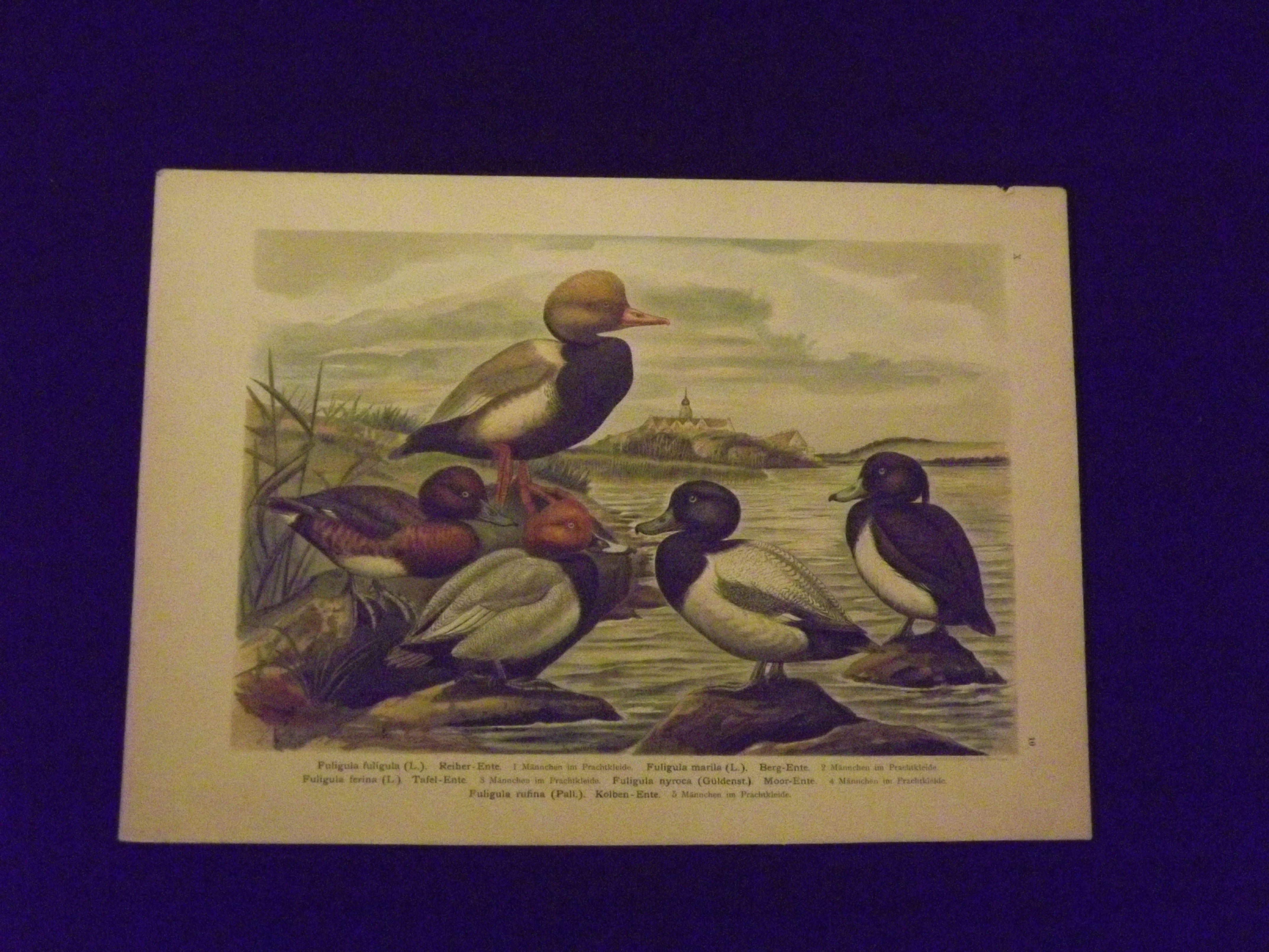 Folio (11" x 15") chromolithograph, colored, archivally matted, attached at top margin, ample margins. Some aging and browning; otherwise bright and clean and very colorful. This very attractive chromolithograph of five ducks is taken from Johann Andreas Naumann's (1747-1846) work on European birds. This illustration shows the ducks against a natural background. May require extra shipping. Ripley and Scribner page 205. Zimmer 453-461.