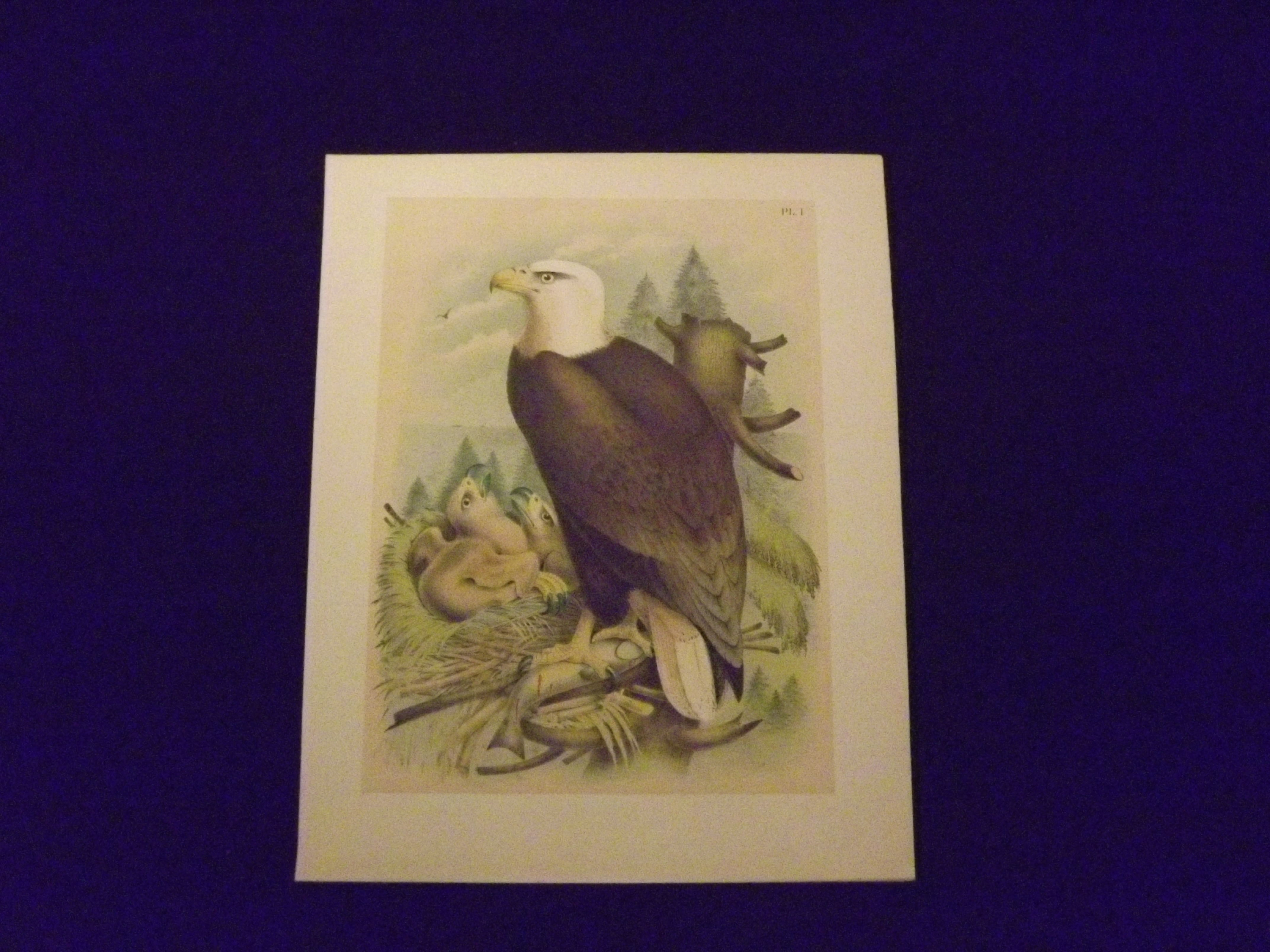 Print, folio (11 1/2" x 15"), chromolithograph, color, plate I, archivally matted, attached at the top with archive tape. Very slight aging; otherwise bright and clean and very attractive. Published in several editions, the plates are extremely attractive. Studer (1840-1904) was born in New York City, and would become a printer and lithographer. He was also an ornithologist, and seems to have been active in this field in the Columbus, Ohio area after the Civil War. However, it is believed that the plates were based on drawings by Theodore Jasper. The plates, while very attractive, are believed to be designed to help with identification. This plate, which features the Bald Eagle, is probably the most outstanding in the collection. The eagle is shown in a natural setting. May require extra postage. Cornell online library website