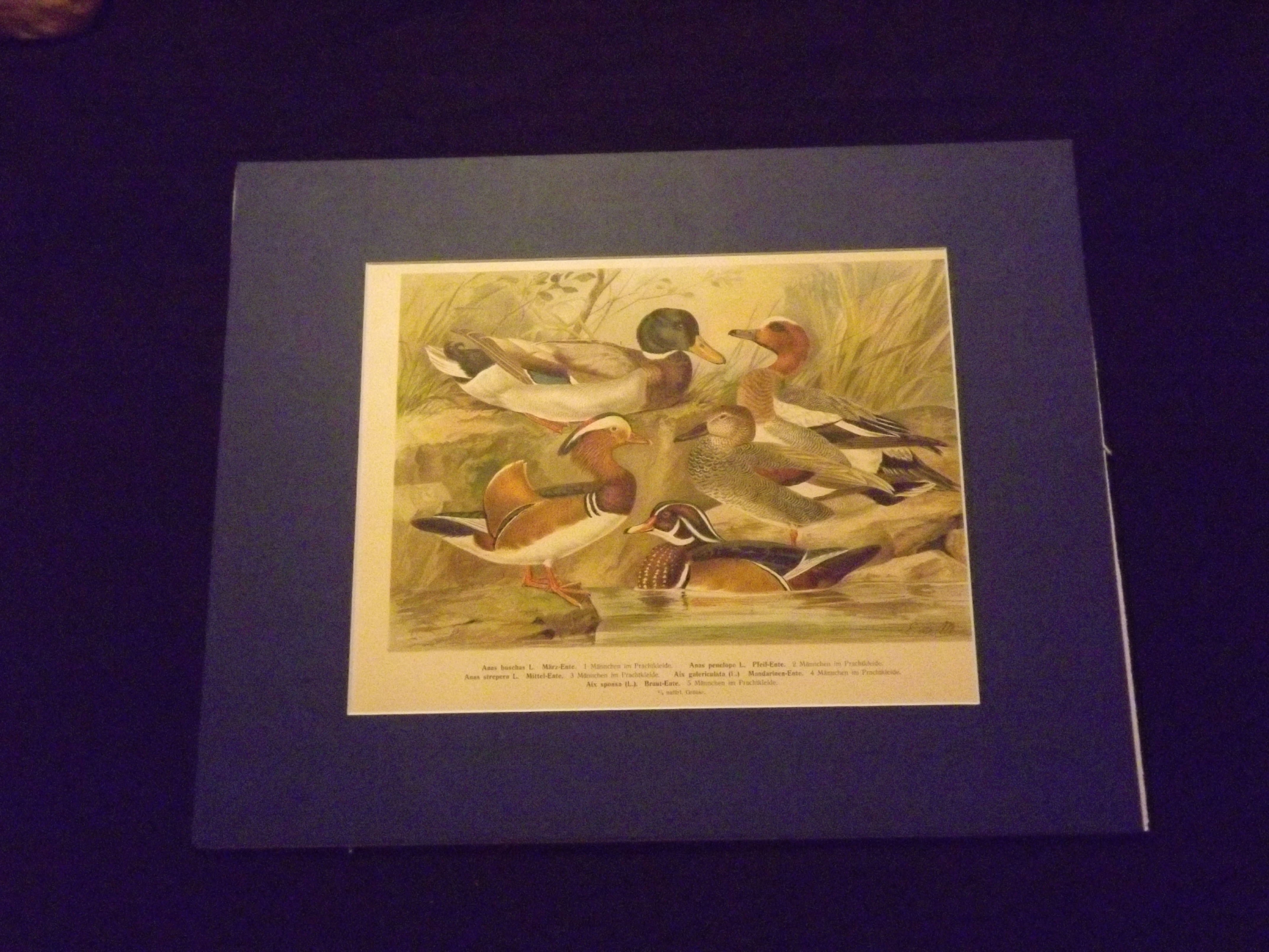 Folio (11" x 15") chromolithograph, colored, archivally matted, attached at top margin, ample margins. Some slight aging and browning, a little darkening at one edge; otherwise bright and clean and very colorful. This very attractive chromolithograph of ducks is taken from Johann Andreas Naumann's (1747-1846) work on European birds. This illustration shows a group ducks against a natural background. A very colorful plate. May require extra shipping. Ripley and Scribner page 205. Zimmer 453-461.