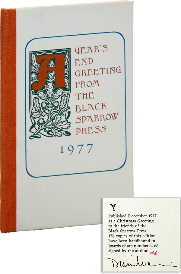 Santa Barbara: Black Sparrow Press, 1977. First Edition. Limited Issue, one of 150 numbered copies signed by the author, this being no.106. Slim octavo; 3/4 buff-colored paper over quarter orange cloth, with titles printed in green and orange on front panel unprinted paper dustjacket; [15pp]. Fine in a Fine dustjacket. Issued as a New Year's Greeting from the Black Sparrow Press in 1977.