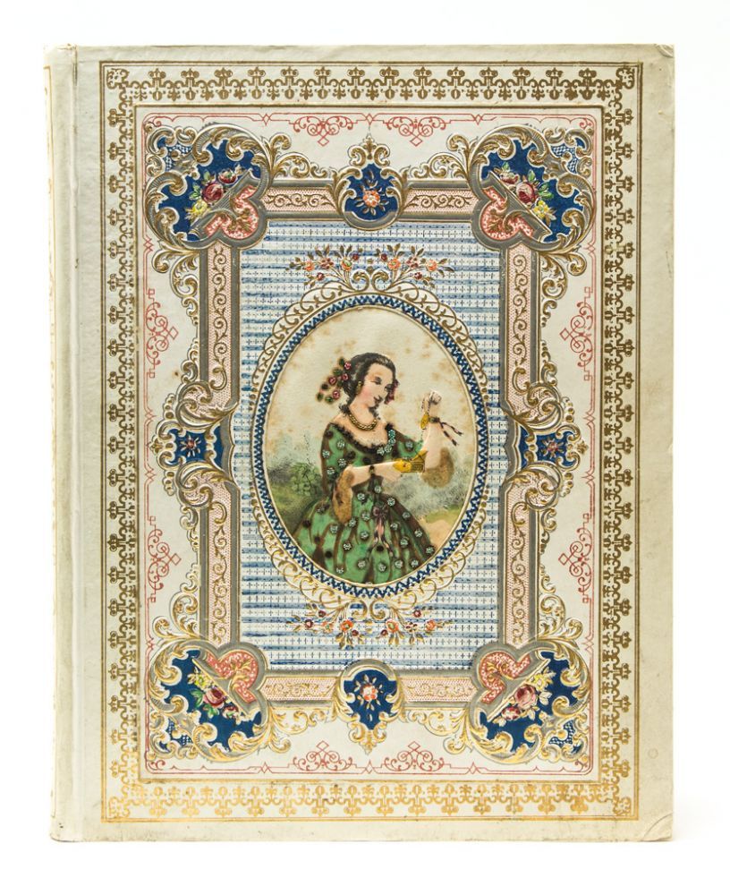 Milan, Venice & Verona: P. Ripamenti Carpano, 1860. Volume 13 only. Engraved title and 9 engraved plates after contemporary Italian painters. xxxix, [i], 68, xv, [iii] pp. 4to. Bound in the publisher’s “chocolate box” style of white paper boards elaborately embossed and chromolithographed, front cover with a central die-cut oval revealing a hand-colored engraving of a woman pulling a necklace from a jewellery box, her dress embellished with small jewels, rear cover with a central embossed image of a floral boquet, some foxing throughout, in a custom cardboard chemise. Volume 13 only. Engraved title and 9 engraved plates after contemporary Italian painters. xxxix, [i], 68, xv, [iii] pp. 4to. Volume 13 of this Italian art periodical, in a beautiful “chocolate box” style binding of embossed and chromolithographed paper boards.
