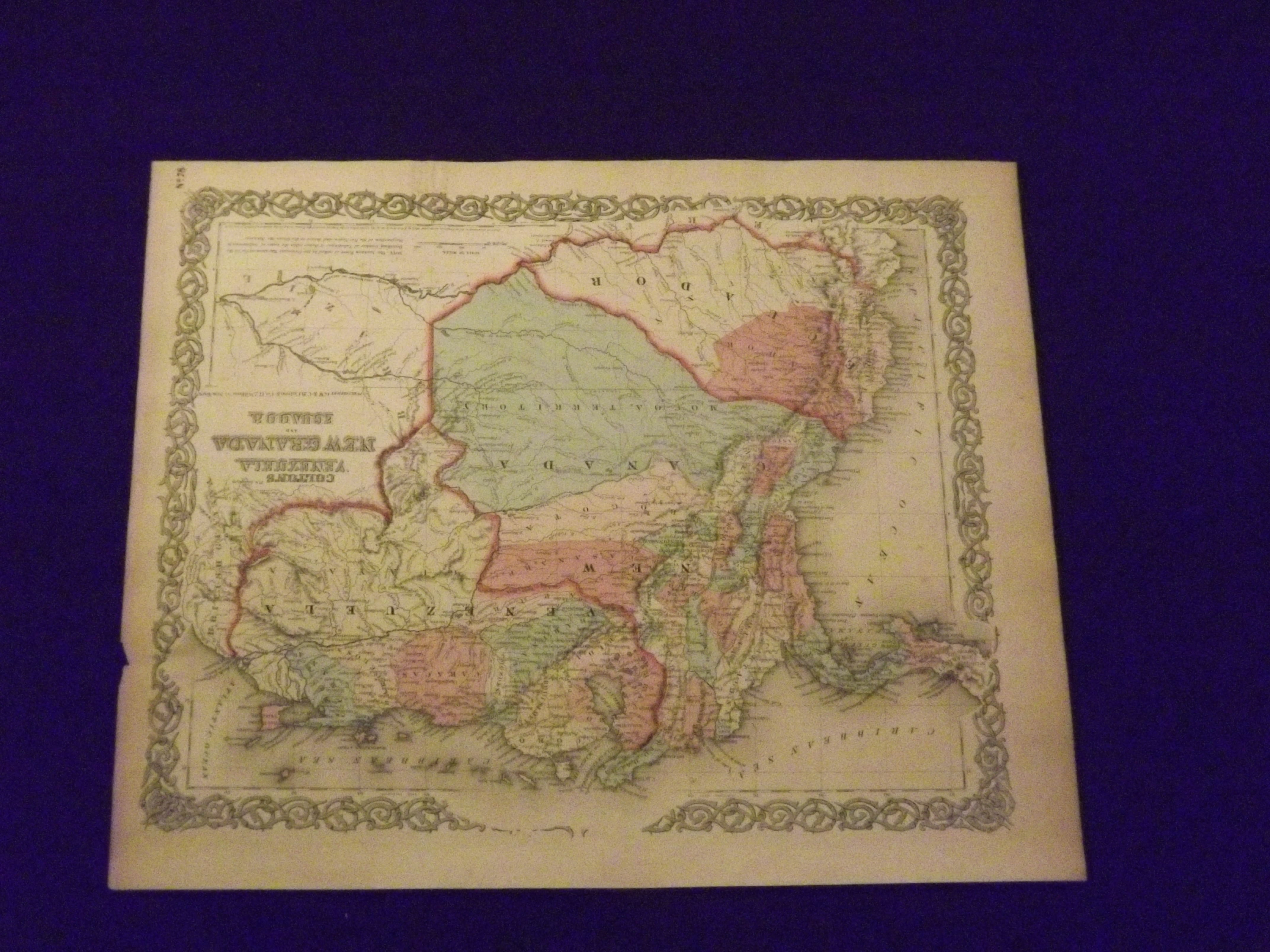 Unbound, colored engraved map, 16 "x 13". Some toning, darkening and aging, a few chips in margins; overall bright and clean and in very good condition. Maps are wrapped with acid free board, or in rigid sleeves. Beginning with J. H. Colton (1800-1893), the Colton family published atlases for over 30 years. Colton's Atlas of the World was first published in 1855 in a large two volume set. In 1857 it became Colton's General Atlas, and Colton's sons, George Woolworth and Charles B. would take over the business. This map of includes Venezuela, New Granada and Ecuudor is attractive and has a decorative border. G.W. & C.B Colton & Co. is listed as the publisher on the map. Extra postage may be required. Ristow 313-326.