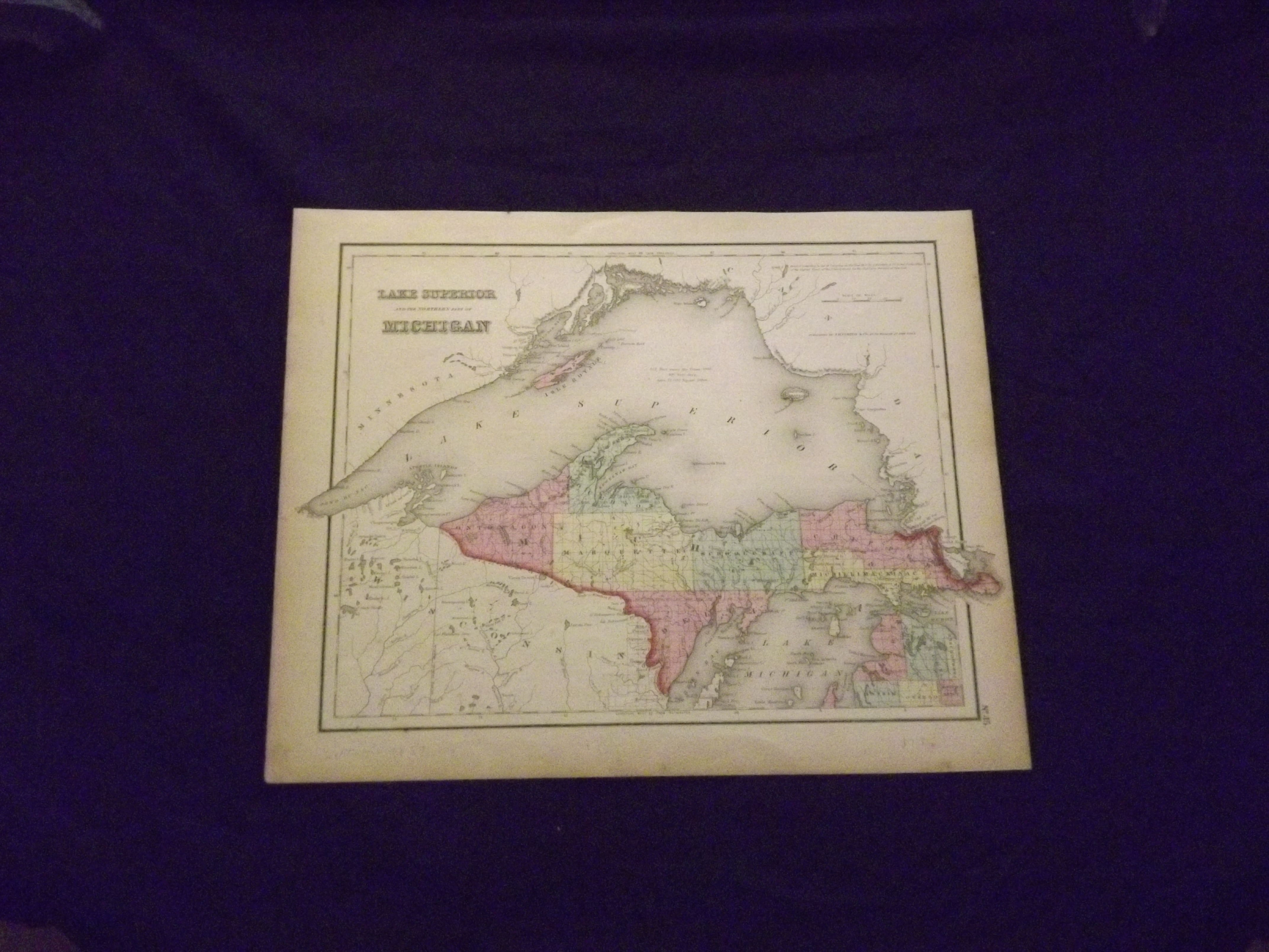 Unbound, colored engraved map, 16 " x 13". Slight toning, darkening and aging; overall bright and clean and in very good condition. Maps are wrapped with acid free board, or in rigid sleeves. Beginning with J. H. Colton (1800-1893), the Colton family published atlases for over 30 years. Colton's Atlas of the World was first published in 1855 in a large two volume set. In 1857 it became Colton's General Atlas, and Colton's sons, George Woolworth and Charles B. would take over the business. This map of Northern Michigan is from the 1857 edition of Colton's General Atlas, even though the copyright date on the map indicates 1855. The mapis unusual in that Lake Superior is emphasized, and only the northern portion of the state is shown. Extra postage may be required. Ristow 313-326.