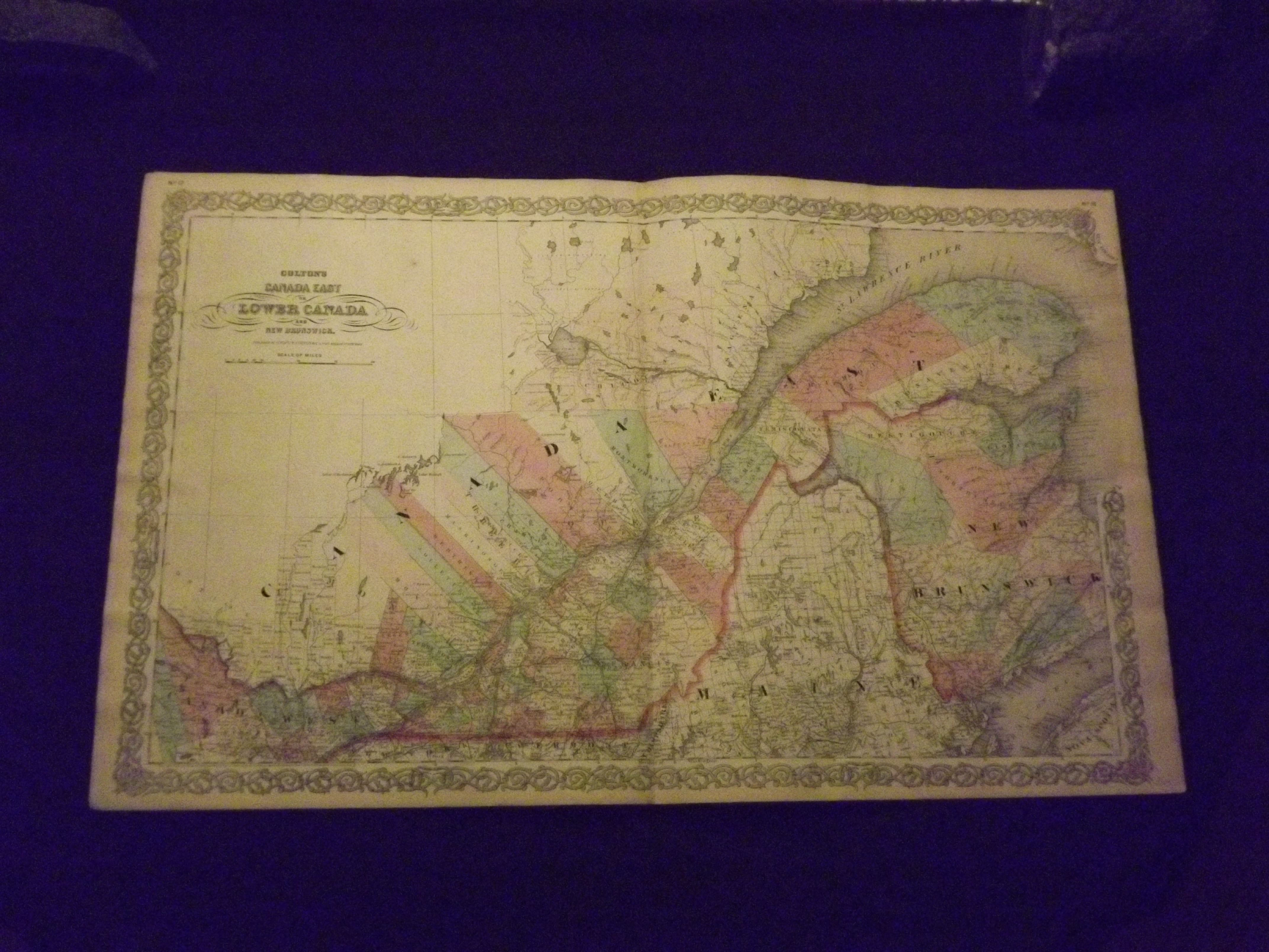 Unbound, colored engraved map, decorative boarder, double page 27" x 17". Slight toning and aging, and a little margin darkening, narrow bottom margin, which is as published; otherwise bright and clean and in very good condition. Maps are wrapped with acid free board, or in rigid sleeves. Beginning with J. H. Colton (1800-1893), the Colton family published atlases for over 30 years. Colton's Atlas of the World was first published in 1855 in a large two volume set. In 1857 it became Colton's General Atlas, and Colton's sons, George Woolworth and Charles B. would take over the business. This map of Eastern Canada is from the 1866 edition of Colton's General Atlas. This double page map is attractive and very colorful, and gives really good geographic detail. You can see part of Nova Scotia and Maine, and there is lots of detail along the St. Lawrence River. Map will be shipped folded at center fold.Ristow 313-326.