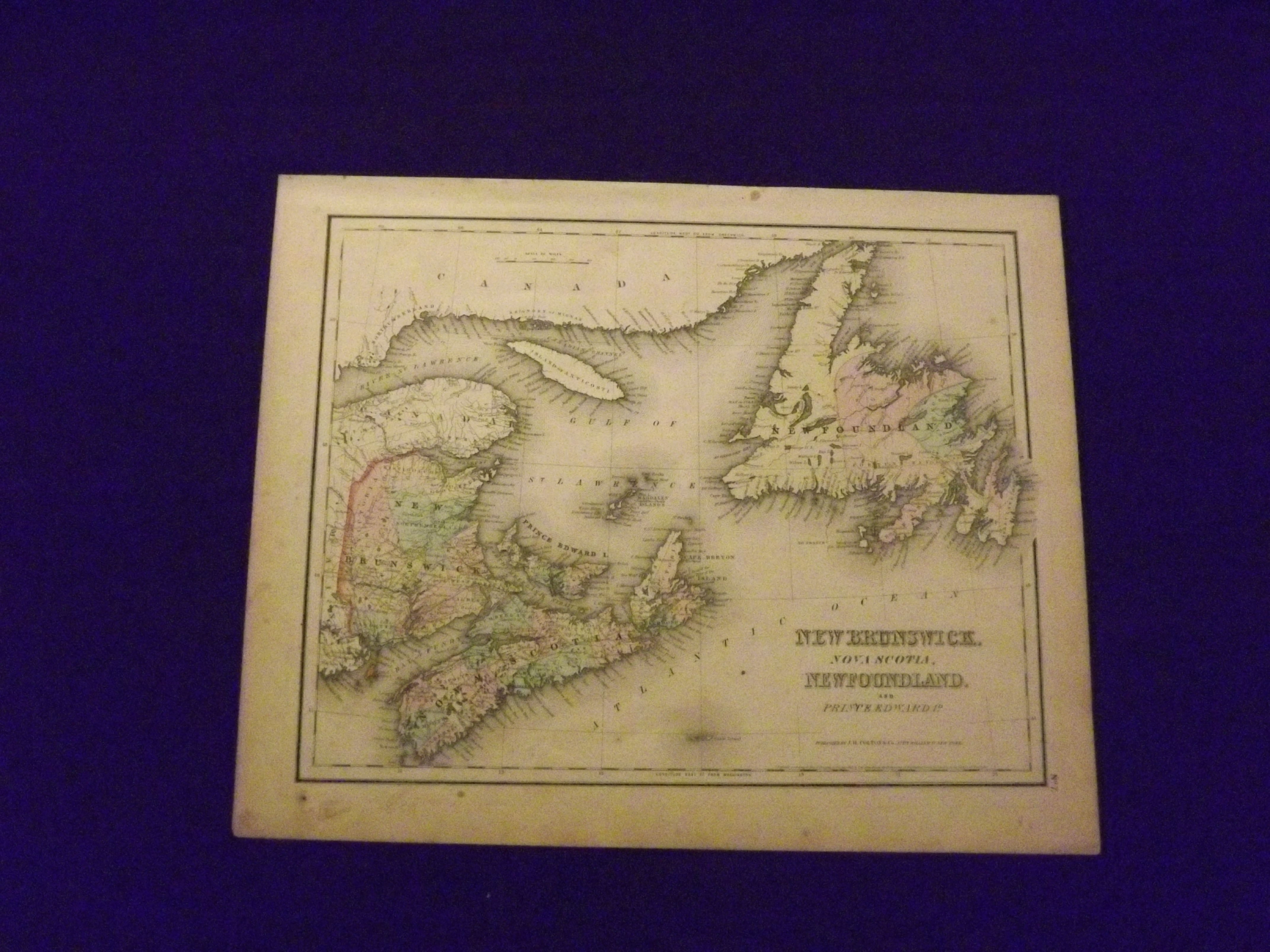 Unbound, colored engraved map, 16" x 13". Slight toning, aging, and a little margin darkening, foxing and finger soiling; overall still bright and clean and in very good condition. Maps are wrapped with acid free board, or in rigid sleeves. Beginning with J. H. Colton (1800-1893), the Colton family published atlases for over 30 years. Colton's Atlas of the World was first published in 1855 in a large two volume set. In 1857 it became Colton's General Atlas, and Colton's sons, George Woolworth and Charles B. would take over the business. This map of New Brunswick, Nova Scotia and Newfoundland is from the 1857 edition of Colton's General Atlas. An fairly attractive map, that has decent color and gives really good detail of this part of Canada. Extra postage may be required. Ristow 313-326.