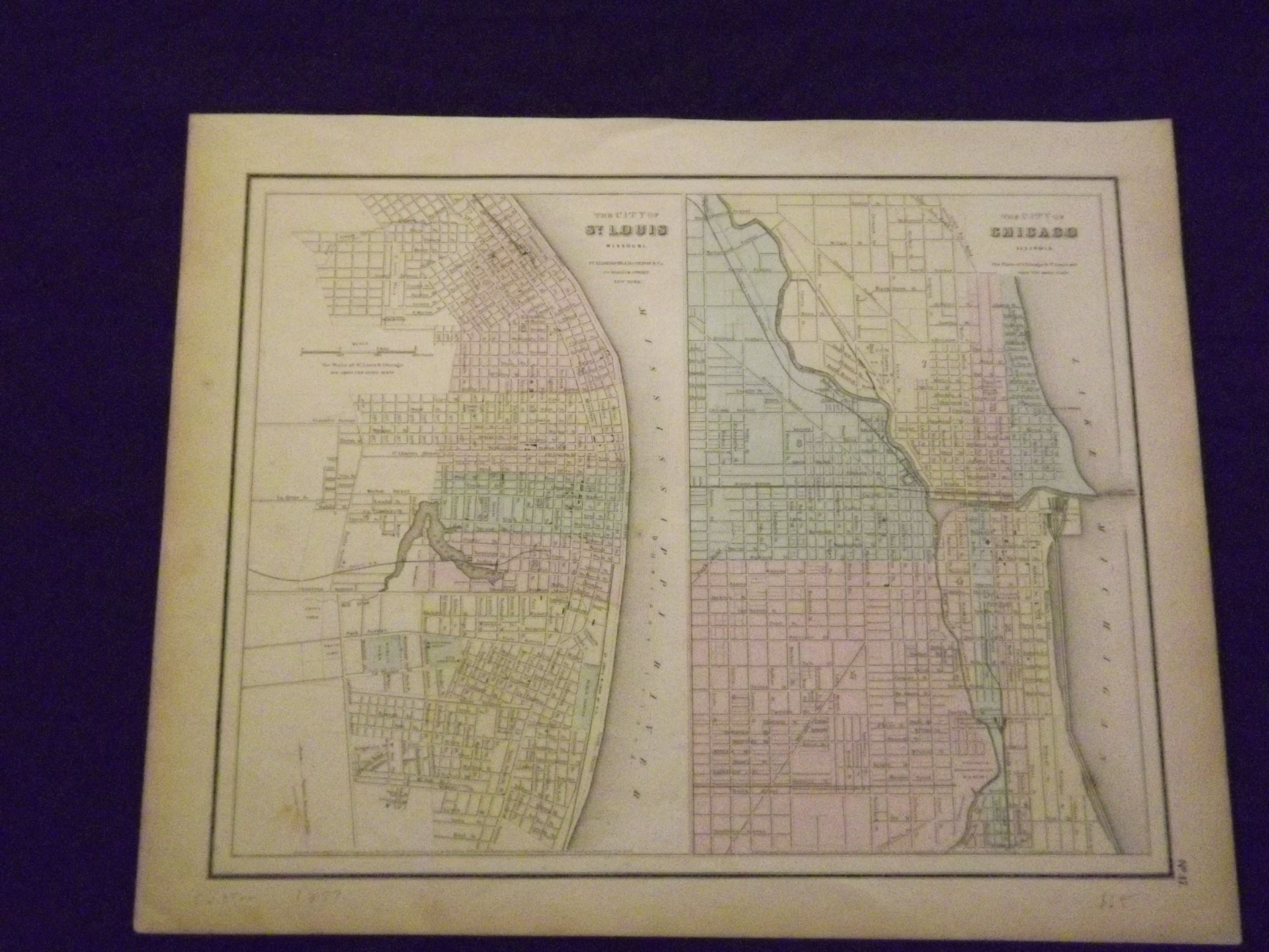 Unbound, colored engraved map, 16" x 13". Slight toning and aging, some darkening in margins; slight center crease, still generally bright and clean overall and in very good condition. Maps are wrapped with acid free board, or in rigid sleeves. Beginning with J. H. Colton (1800-1893), the Colton family published atlases for over 30 years. Colton's Atlas of the World was first published in 1855 in a large two volume set. In 1857 it became Colton's General Atlas, and Colton's sons, George Woolworth and Charles B. would take over the business. This pre Civil War map of the cities of St. Louis and Chicago is from the 1857 edition of Colton's General Atlas, even though the copyright date on the map indicates 1855. The map is fairly colorful, and provides some fairly decent street detail. The border is a straight-line, which is different from the decorative version in other editions. May require extra postage. Ristow 313-326.