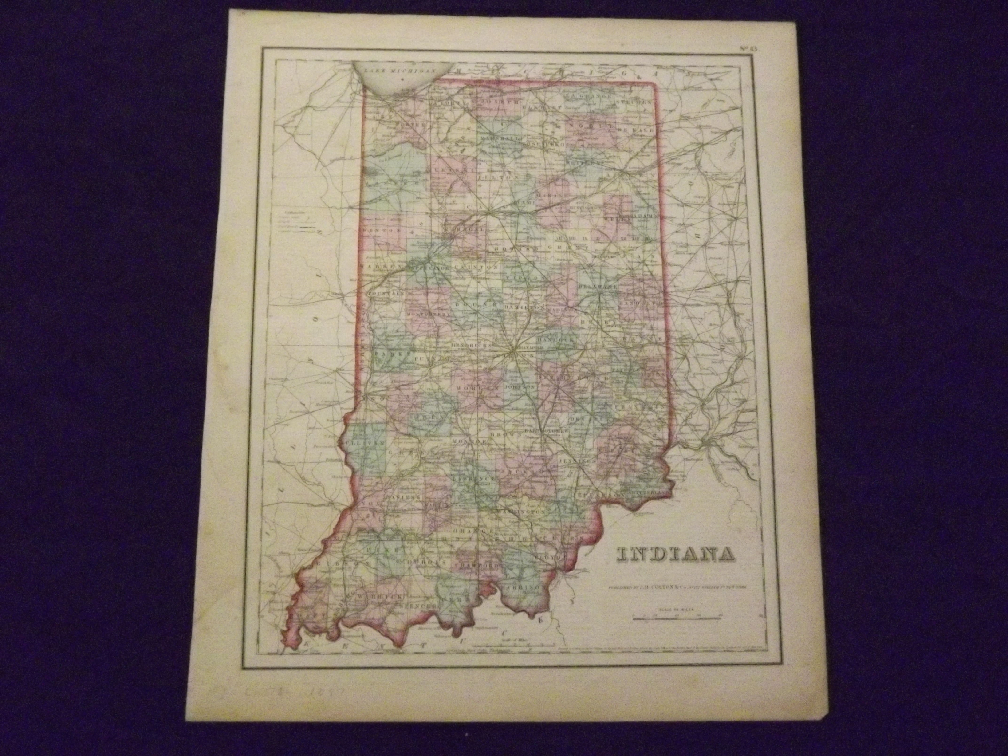 Unbound, colored engraved map, decorative boarder, 16"x 13". Slight foxing, toning and aging, margins with a little darkening and finger soiling; overall generally bright and clean and in very good condition. Maps are wrapped with acid free board, or in rigid sleeves. Beginning with J. H. Colton (1800-1893), the Colton family published atlases for over 30 years. Colton's Atlas of the World was first published in 1855 in a large two volume set. In 1857 it became Colton's General Atlas, and Colton's sons, George Woolworth and Charles B. would take over the business. This map of Indiana is from the 1857 edition of Colton's General Atlas, even though the copyright date on the map is 1855. The map is colorful with a fair amount of detail on Indiana counties. May require extra postage. Ristow 313-326. # 103212