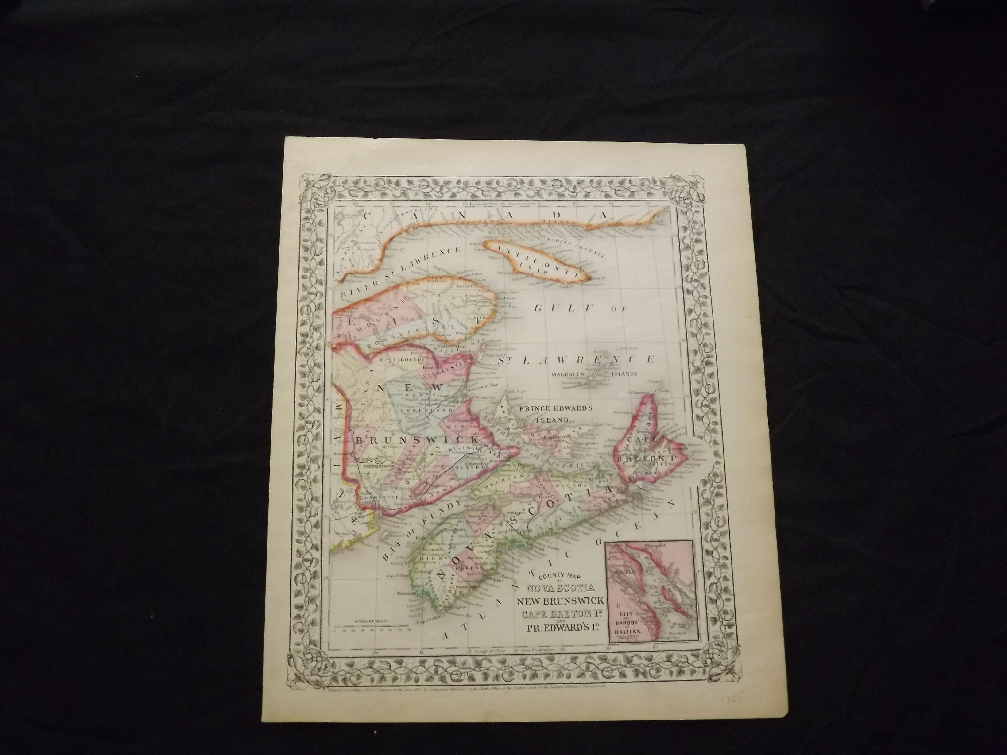 Unbound, colored engraved map, decorative boarder, 14"x 11". Slight toning, browning and aging; overall very bright and clear and in very good shape. Maps are wrapped with acid free board, or in rigid sleeves. The Mitchell family started to produce atlases in 1846, and continued into the early 1890s. Around 1860, S. Augustus Mitchell Jr. took over, and the atlas would be called Mitchell's New General Atlas. This is a colorful map of a portion of eastern Canada from the 1869 installment of that atlas. The map is bright and crisp, and includes a small inset map of Halifax. Extra postage may be required. Ristow 311-313.
