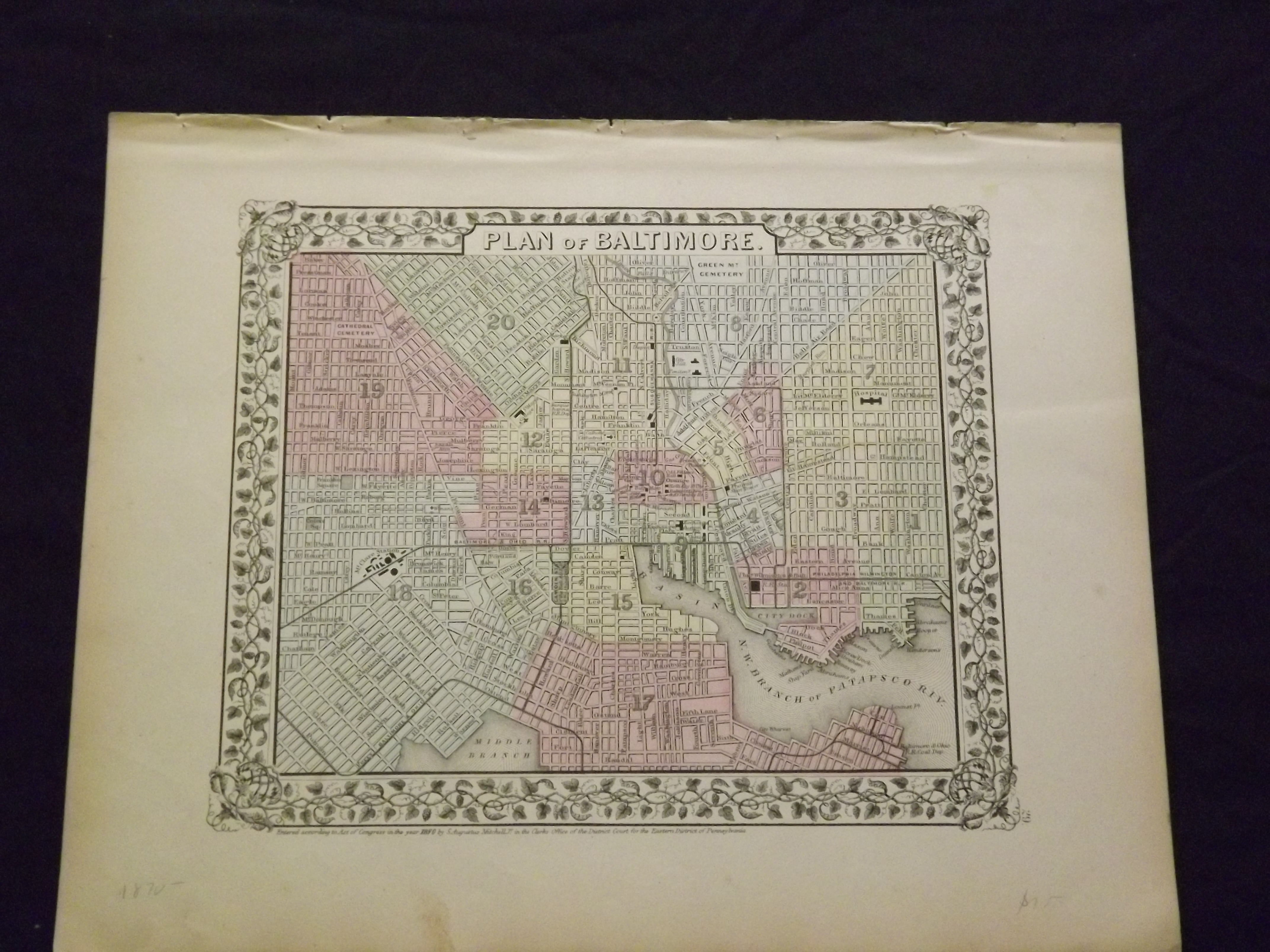 Unbound, colored engraved map, decorative border, 14" x 11". Slight browning and aging, top edge just a little rough; otherwise bright and clean and very good. Maps are wrapped with acid free board, or in rigid sleeves. The Mitchell family started to produce atlases in 1846, and continued into the early 1890s. Around 1860, S. Augustus Mitchell Jr. took over, and the atlas would be called Mitchell's New General Atlas. This is a detailed single page map of Baltimore from the 1870 installment of this atlas. The map shows a lot of street detail with nice coloring. Extra postage may be required. Ristow 311-313.