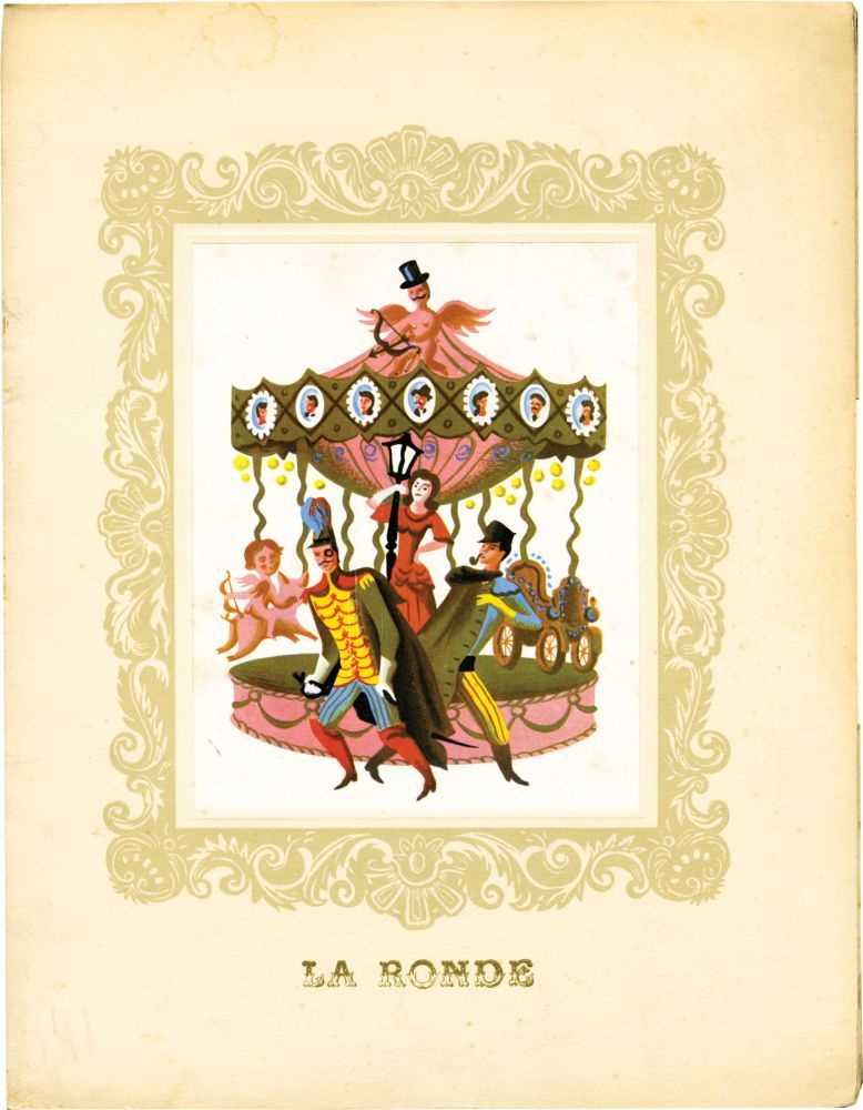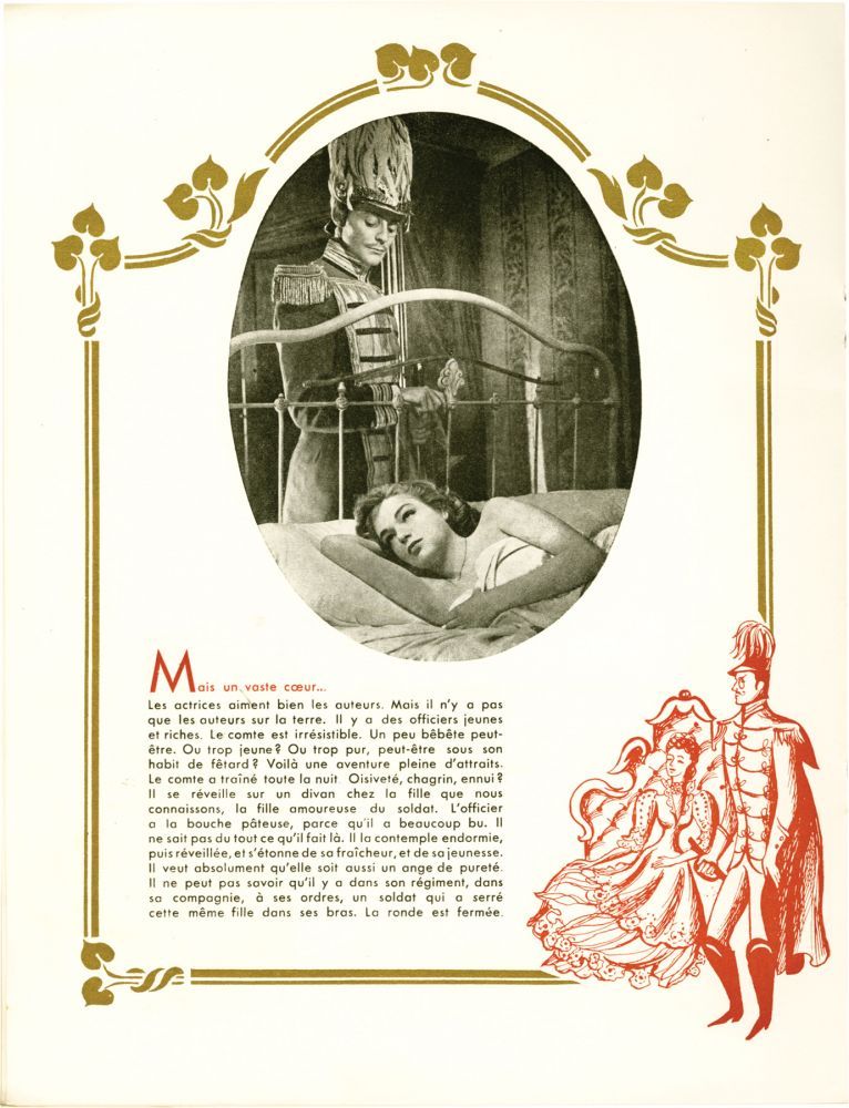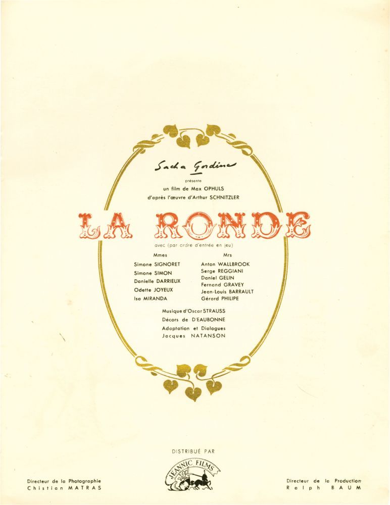 Paris: Films Sacha Gordine / Jeannic Films, 1950. Original pressbook for the 1950 film. Based on the play, "Reigen" by Arthur Schnitzler, in which an all-knowing interlocuter guides the audience through a series of affairs in Vienna, circa 1900.