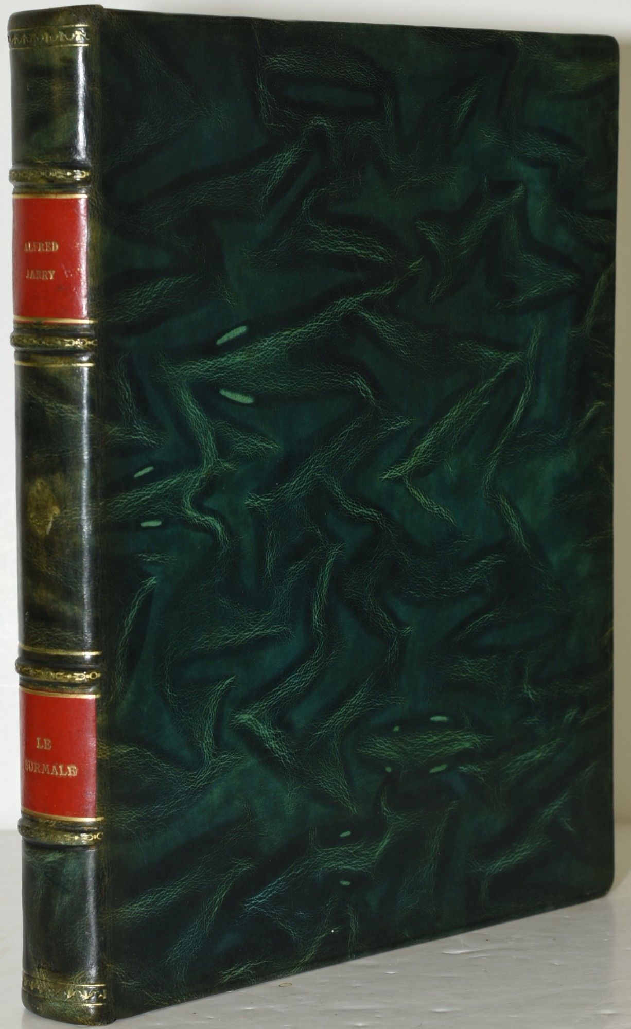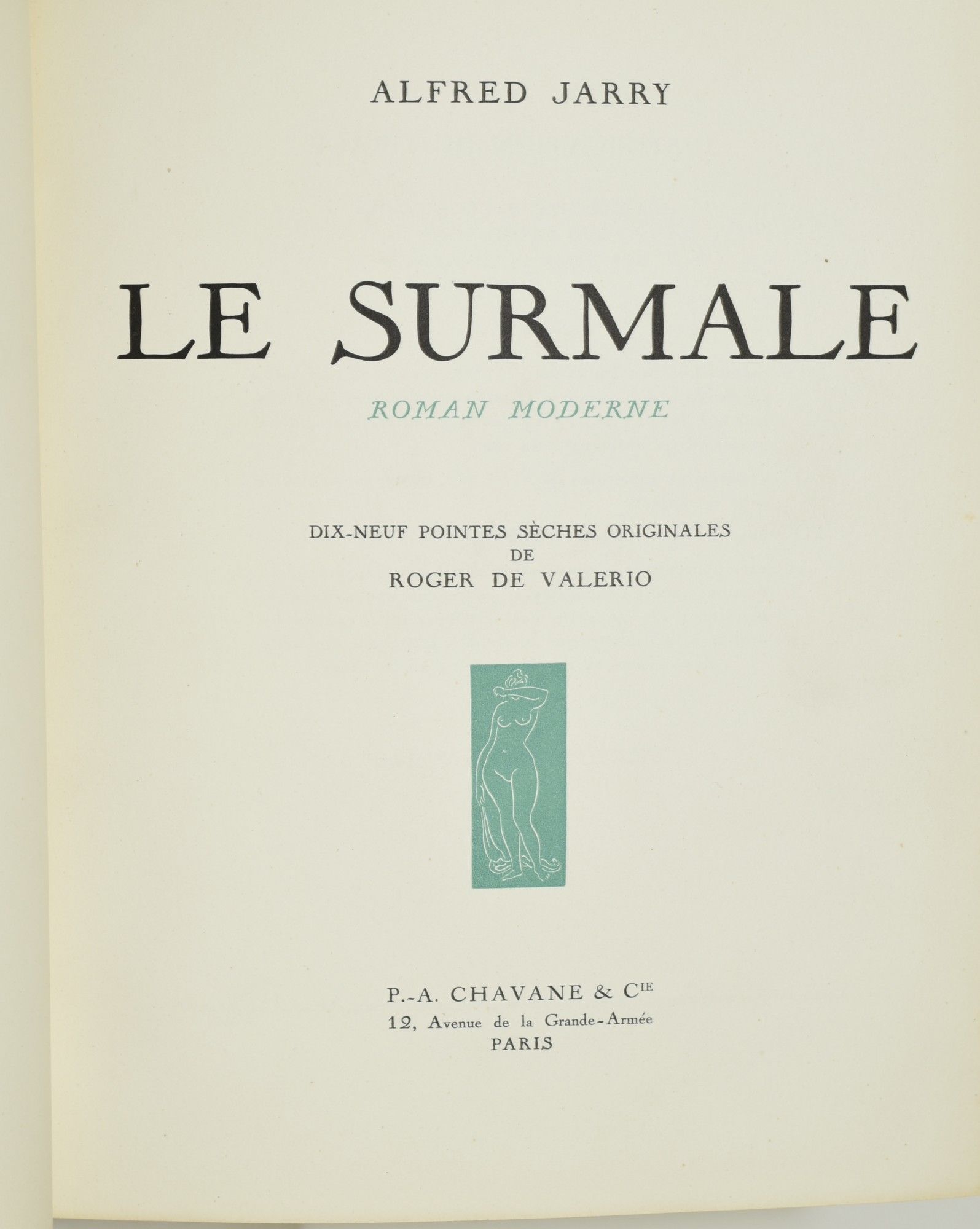 Paris: P.-A. Chavanne & Cie, 1948. Limited Edition. Full Leather. Very Good+ binding. A beautiful production of symbolist writer Alfred Jarry's Le Surmale ["The Supermale"]. Printed in green and black, with 19 drypoint etchings by Roger De Valerio. De Valerio is perhaps best known as the editor of Le Rire, and a designer of posters. He illustrated two books--Le Supremale, and Sacha Guitry's The Lion and the Hen. Originally issued in wrappers, this copy has been rebound in Spanish leather. #246 of 260 copies. Very Good+ binding.