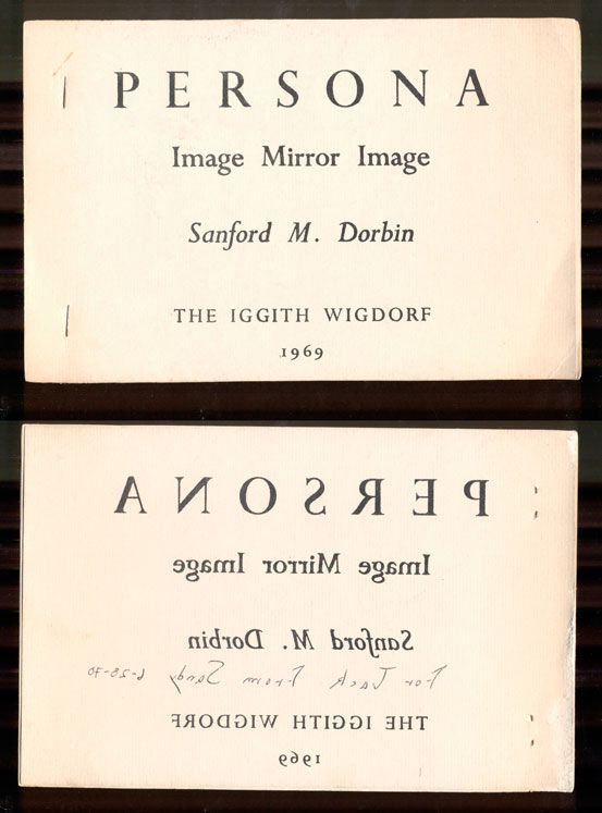 NP: The Iggith Wigdorf, 1969. First edition. 18 leaves printed on rectos only. Oblong [8.5 x 5.5]; beige printed wraps, side-stapled. Wrappers show some mild rubbing, minor wear to rear spine edge, else near fine. Rear wrap is printed in the mirror image of the front wrap. Inscribed on the rear wrap by the author, written backwards (to match the way the rear wrap is printed): "07-82-6 ydnaS morF kcaJ roF" [For Jack From Sandy 6/28-70]. The colophon reads: "PERSONA exists in this edition of 200 copies & the stencils burned.