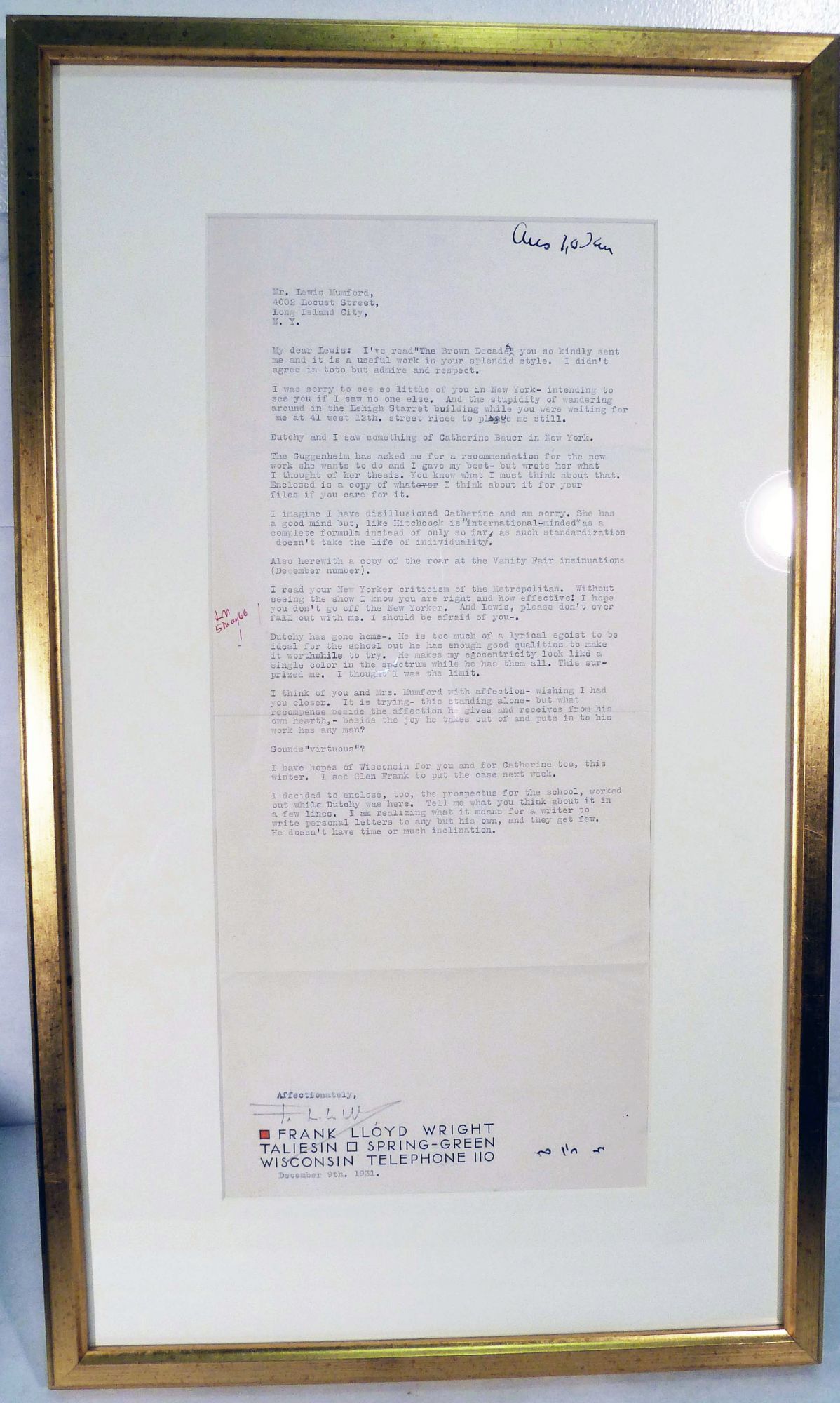 Taliesin, 1931. Glass Framed. Fine condition, matted and gilt framed -- suitable for hanging. Typed letter, 45 x 20 cm. to friend and architectural critic, Lewis Mumford. "My dear Lewis: I've read `The Brown Decade' you so kindly sent me and it is a useful work in your splendid style. I didn't agree in total but admire and respect......The Guggenheim has asked me for a recommendation for the new work she wants to do and I gave my best - but wrote her what I though of her thesis. You know what I must think about that. Enclosed is a copy of what I think about it for your files if you care for it."
