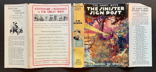 New York: Grosset & Dunlap, 1936. 1st. Decorative Cloth. Collectible; Very Good/Very Good. The 1936 correct 1st edition (Carpentier, Heffelfinger) of this, the 15th title in the original Hardy Boys series. Issue points: This is the 15th and last title listed on the front flap, there are 14 "X Bar X Boy" titles listed on the rear flap and the back panel lists 9 "Great West" titles. A solid, very presentable copy to boot. Tight and VG+ in its light-brown cloth (with no writing or marks of any kind internally) in a bright, price-clipped, VG dustjacket, with very light soiling along the foot of the spine and, inconspicuously, to the inside of the jacket. Thick 12mo, 215 pgs. Frontispiece, endpapers and pastedowns and dustjacket design by J. Clemens Gretter.