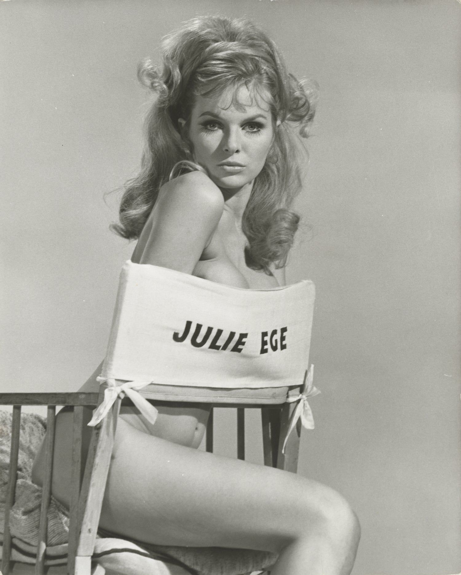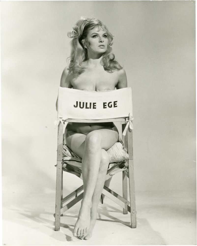 London: Anglo-EMI, 1970. Three vintage black-and-white borderless double weight reference photographs Julie Ege, taken as test shots for the 1971 film. Ege is shown sitting in cloth folding chair with her name on it, in various positions designed to hide her breasts as unsuccessfully as possible.