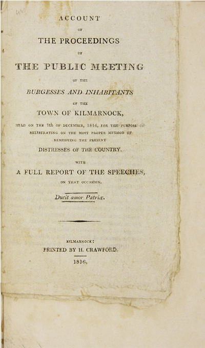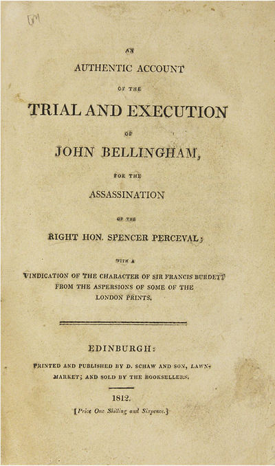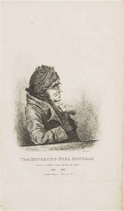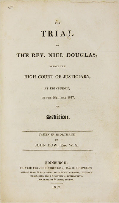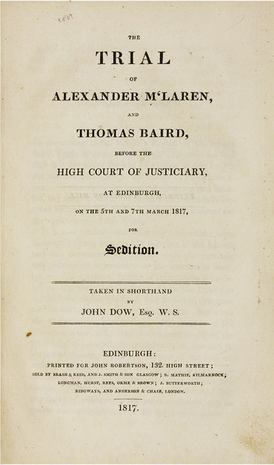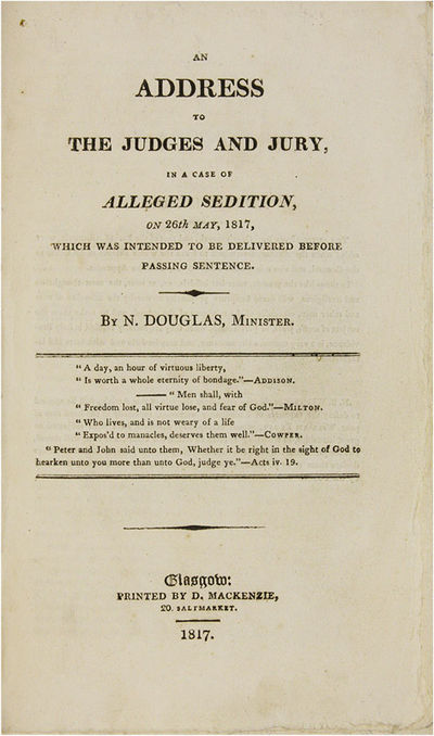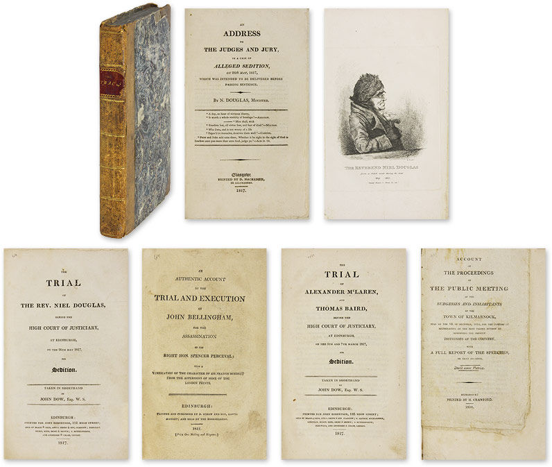 1817. 5 titles; Glasgow: Printed by D. Mackenzie, 1817.. 5 titles; Glasgow: Printed by D. Mackenzie, 1817. Five Nineteenth-Century Scottish Treason Trials [Trials]. [Treason]. Douglas, Niel [1750-1823], Defendant. An Address to the Judges and Jury, In a Case of Alleged Sedition, On 26th May, 1817, Which was Intended to be Delivered Before Passing Sentence. Glasgow: Printed by D. Mackenzie, 1817. 40 pp. [Bound with] Dow, John, Reporter. The Trial of the Rev. Niel Douglas, Before the High Court of Justiciary, At Edinburgh, On the 26th May 1817, For Sedition. Edinburgh: Printed for John Robertson, 1817. [ii], 50 pp. Portrait frontispiece. [And] [Bellingham, John]. An Authentic Account of the Trial and Execution of John Bellingham, For the Assassination of the Right Hon. Spencer Perceval. With a Vindication of the Character of Sir Francis Burdett from the Aspersions of Some of the London Prints. Edinburgh: Printed and Published by D. Schaw and Son, 1812. [ii], [5]-65 pp. [And] M'Laren, Alexander, Defendant. Baird, Thomas, Defendant. Dow, John, Reporter. The Trial of Alexander M'Laren, And Thomas Baird, Before the High Court of Justiciary, At Edinburgh, On the 5th and 7th March 1817, For Sedition. Edinburgh: Printed for John Robertson, 1817. vi, 153 pp. [And] Account of the Proceedings of the Public Meeting of the Burgesses and Inhabitants of the Town of Kilmarnock, Held on the 7th of December, 1816, For the Purpose of Deliberating on the Most Proper Method of Remedying the Present Distresses of the Country. With a Full Report of the Speeches on that Occasion. Kilmarnock: Printed by H. Crawford, 1816. 45 pp. Octavo (8-1/2" x 5"); Account: Octavo (6-1/2" x 4"). Stab-stitched pamphlets bound into contemporary three-quarter sheep over marbled boards, lettering piece and gilt fillets to spine. Moderate rubbing, a few scuffs to boards, some chipping to spine ends, corners bumped, front hinge cracked. Light to moderate toning, soiling to title page of Bellingham, internally clean. $1,850. * An exemplary gathering of five tracts, four of them concerning the trials of Douglas and M'Laren, the first trials for sedition held in Scotland during the aftermath of the Napoleonic Wars, a time of acute economic distress and social protest. These took place concurrently with the London trials of William Hone. Douglas, an eccentric non-conformist minister, poet, abolitionist and visionary.