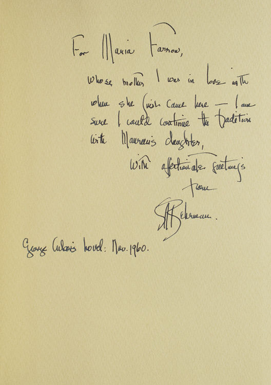 New York: Random House, 1960. First edition. Illustrated, 317 pp. 1 vols. 8vo. Publisher's blue cloth, paper dust jacket. Some fading to spine, jacket spine toned and some tears and browning. First edition. Illustrated, 317 pp. 1 vols. 8vo. Charmingly inscribed by Behrman to the 15 year old Maria (Mia) Farrow, November 1960, with the bookplate of her father John Villier Farrow.