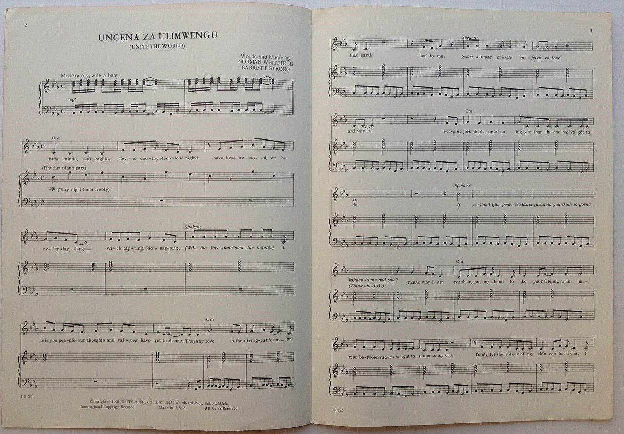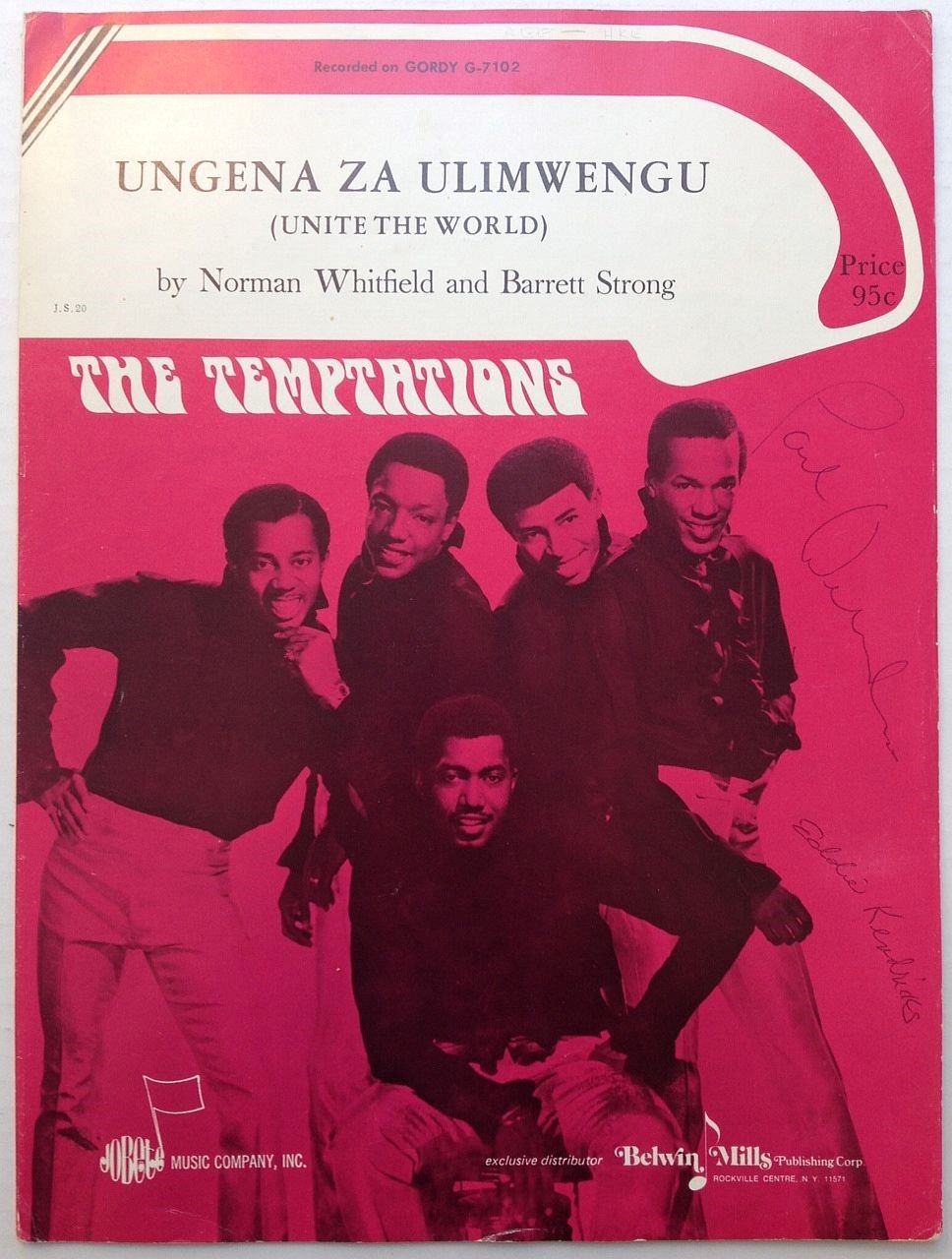 Rockville Centre, NY: Belwin Mills, 1970. pamphlet. Signed sheet music for "Ungena Za Ulimwengu (Unite the World)" as recorded by The Temptations. 4 pages, 12 x 9 inches (gently worn at the corners). Published by Belwin Mills in Rockville Centre, New York in 1970. Very good condition.