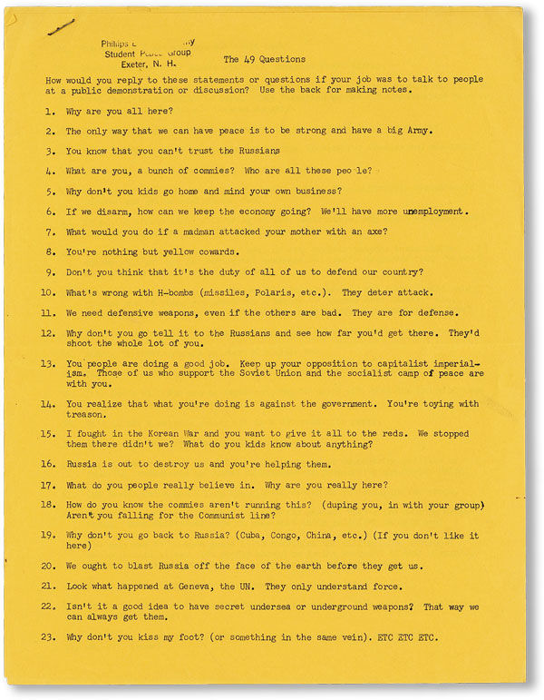 [Exeter, NH: Philips Exeter Academy Student Peace Group, N.D. but ca.1962]. Two mimeographed sheets, printed in black on goldenrod stock and stapled at upper left corner; 21.5cm X 28cm (8.5" X 11"); [2pp]. Horizontal fold at center, with minor wear and a few tiny creases to extremities; Very Good+. A curious list of questions designed to prepare demonstrators or debaters for issues they might be challenged with in a public forum. The sheets are undated, but appear to be compiled around the time of the Cuban Missle Crisis. No imprint, but the preliminary sheet bears the rubber stamp of the Philips Exeter Academy Student Peace Group; it is unclear whether the questions were compiled by the Academy or merely used by them. The questions range from the obvious ("Why are you all here?") to questions of a more provocative nature ("What are you, a bunch of commies?, "Why don't you go back to Russia?," and "What would you do if Russia attacks? Remember Pearl Harbor"). No copies located in OCLC.