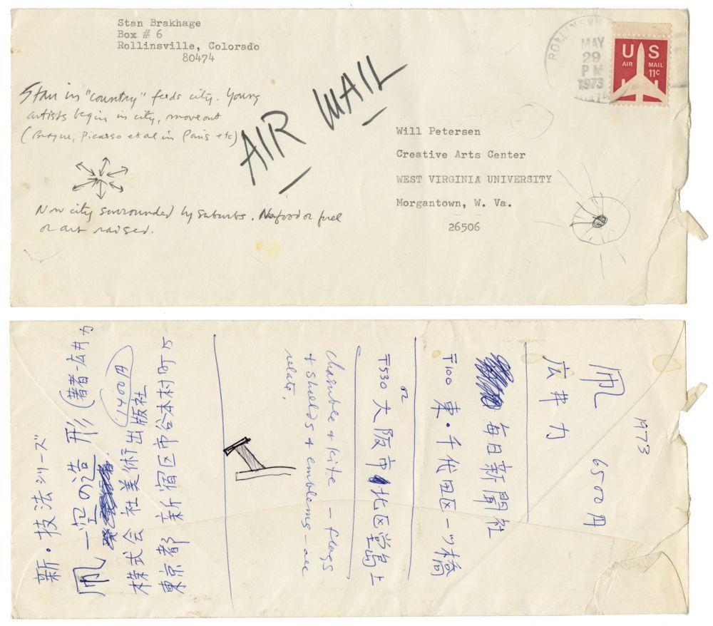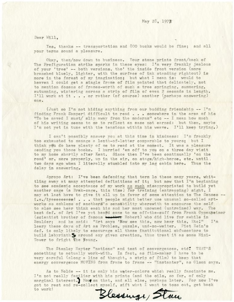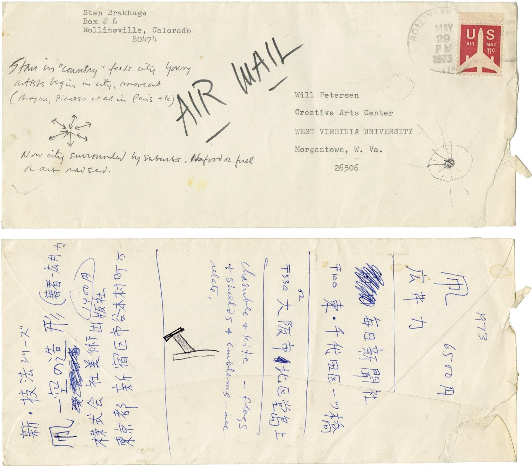 N.p.: N.p., 1973. Lengthy typed letter signed from Stan Brakhage to Will Petersen, roughly 500 words, dated May 28, 1973. Petersen was the director of the Creative Arts Center at West Virginia University, and Brakhage's letter confirms an upcoming talk at the university and answers in some detail a number of Petersen's questions. With Brakhage's manuscript signature in black ink at the closing: "Blessings / Stan." Included is the original mailing envelope, with Brakhage's Rollinsville, Colorado PO Box address, postmarked May 29, 1973. Several ink annotations on the envelope, presumably by Petersen, some relating to thoughts on Brakhage.