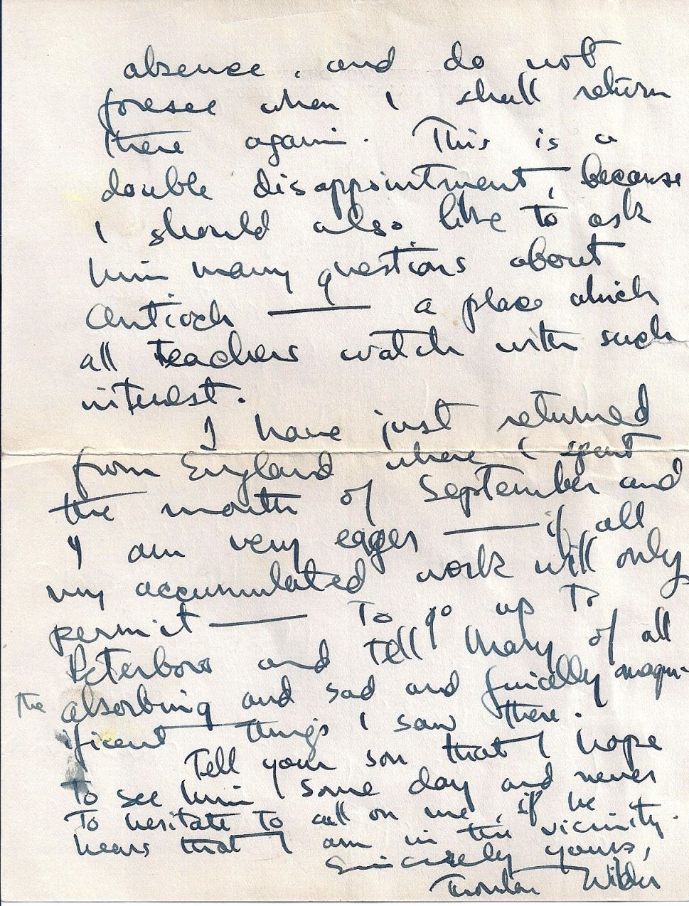 New York: Coward-McCann, Inc., (1938). First Edition. Hardcover. Some sunning to covers. About Very Good, lacking the dustwrapper. The letter has a crease from folding, otherwise Fine, with envelope. Winner of the Pulitzer Prize for Drama and a touchstone of American theater. INSCRIBED and SIGNED by the author on the half-title page: "For Roger Seccombe/with the best wishes of/Thornton Wilder/New Haven/November/1938." Laid in is a 2-page AUTOGRAPH LETTER SIGNED (ALS) "Thornton Wilder" written on the recto and verso of a single sheet of personal stationery addressed to Seccombe and inserted in a handwritten, postmarked envelope addressed by Wilder to Roger Seccombe dated 25 October 1941 tipped in at the front endpaper. In full: "Many thanks for your letter. It is a great pleasure to hear from any relative or friend of my friend whom I admire so much. I wish I were in Chicago and could have some talks with your son. However, I rejoined the faculty this past summer alone, after four years' absence, and do not foresee when I shall return there again. This is a double disappointment, because I should also like to ask him many questions about Antioch -- a place which all teachers watch with such interest. I have just returned from England where I spent the month of September and I am very eager -- if all my accumulated work will only permit -- to go up to Peterboro and tell Mary of all the absorbing and sad and finally magnificent things I saw there. Tell your son that I hope to see him some day and never to hesitate to call on me, if he hears that I am in the vicinity. Sincerely yours, Thornton Wilder." In September of 1941, Wilder went to England to attend a congress of the International PEN (Poets, Essayists, and Novelists) Club. The main theme of the congress was "Literature and the World after the War," but the heart of the issue was the responsibility of the writer in time of war. Wilder was part of a vocal group that opposed the president of British PEN, Storm Jameson, who insisted that members commit themselves exclusively to propaganda for the Allied cause. (Stein, Gertrude; Wilder; Thornton; Burns, Edward McNall; Dydo, Ulla E.; Rice, William. THE LETTERS OF GERTRUDE STEIN AND THORNTON WILDER. New Haven: Yale University Press, 2006; page 297). When not caught up in navigating the politics of PEN, Wilder wrote to American educational philosopher Robert Maynard Hutchins that his days in London, "were crowded with inspections of ruins, defense activities, airplane factories, bomber commands, luncheons, interviews with works, journalists. Ministers, dinners, writers, and so on" (Wilder, Thornton; Wilder, Robin G.; Bryer, Jackson R. THE SELECTED LETTERS OF THORNTON WILDER. New York: Harper Perennial, 2009; page 400). It is perhaps to this variety of experiences while in London which Wilder refers in this letter when he says, "I have just returned from England where I spent the month of September and I am very eager -- if all my accumulated work will only permit -- to go up to Peterboro and tell Mary of all the absorbing and sad and finally magnificent things I saw there."
