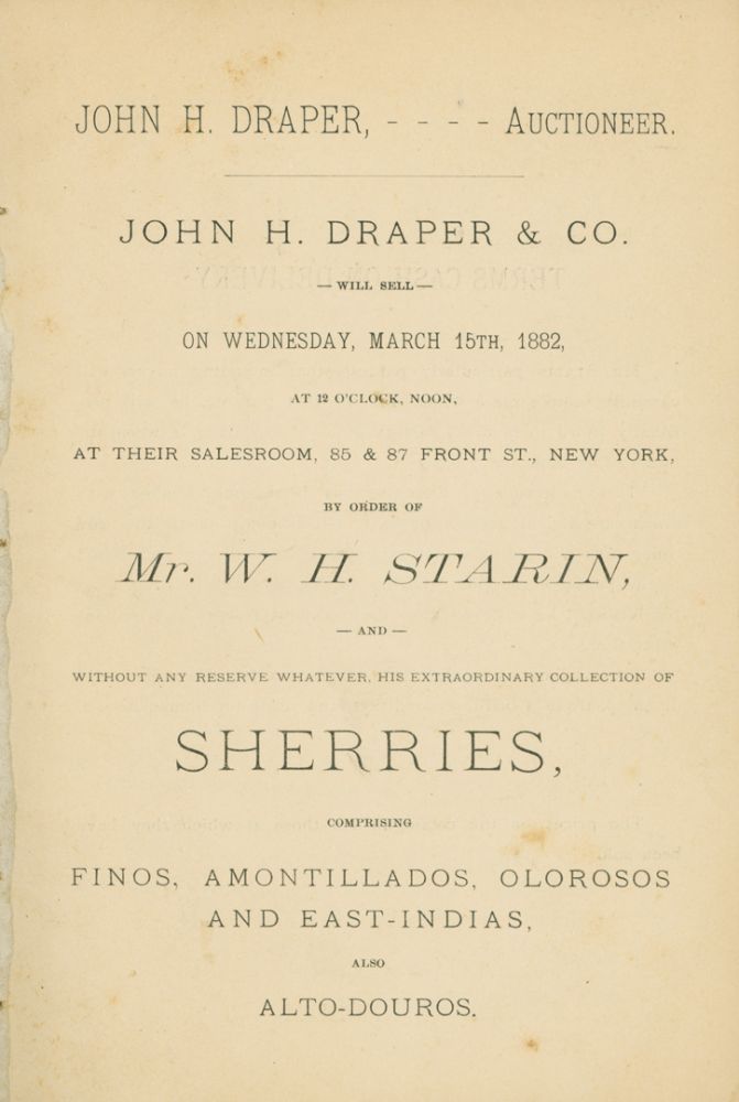 (WINE AUCTION) John H. Draper & Co. Will Sell on Wednesday, March 15th, 1882 … by Order of Mr. W.H. Starin, and Without any Reserve Whatever, His Extraordinary Collection of Sherries, Comprising Finos, Amontillados, Olorosos and East-Indias, also Alto-Douros. 17 pp. 103 lots