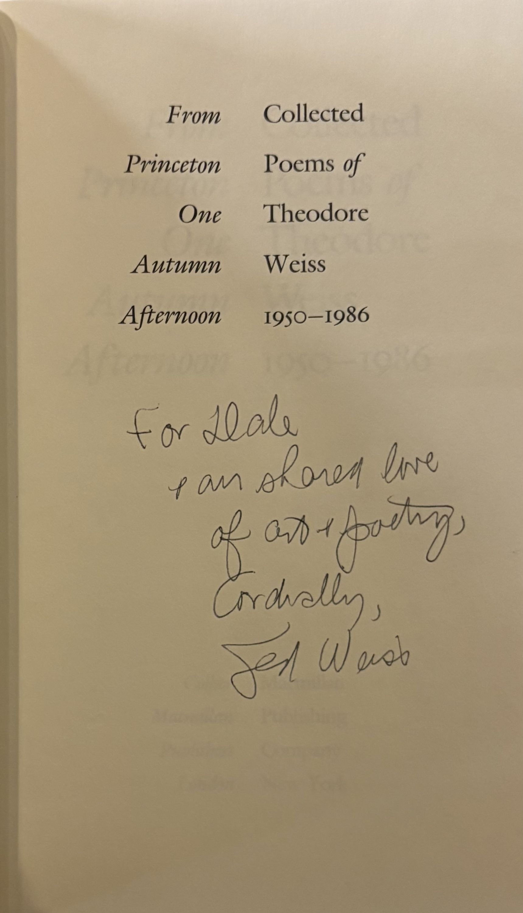 Inscribed on the half-title page: "For Dale & and our shared love of art & poetry, Cordially, Ted Weiss."