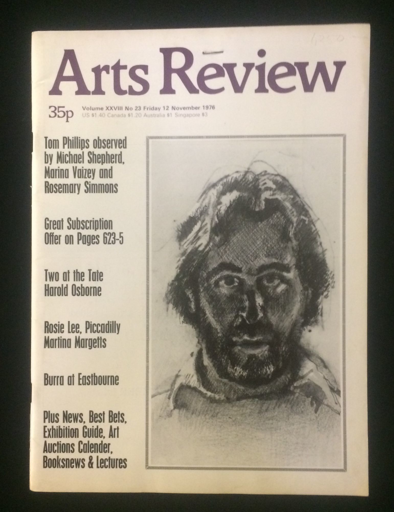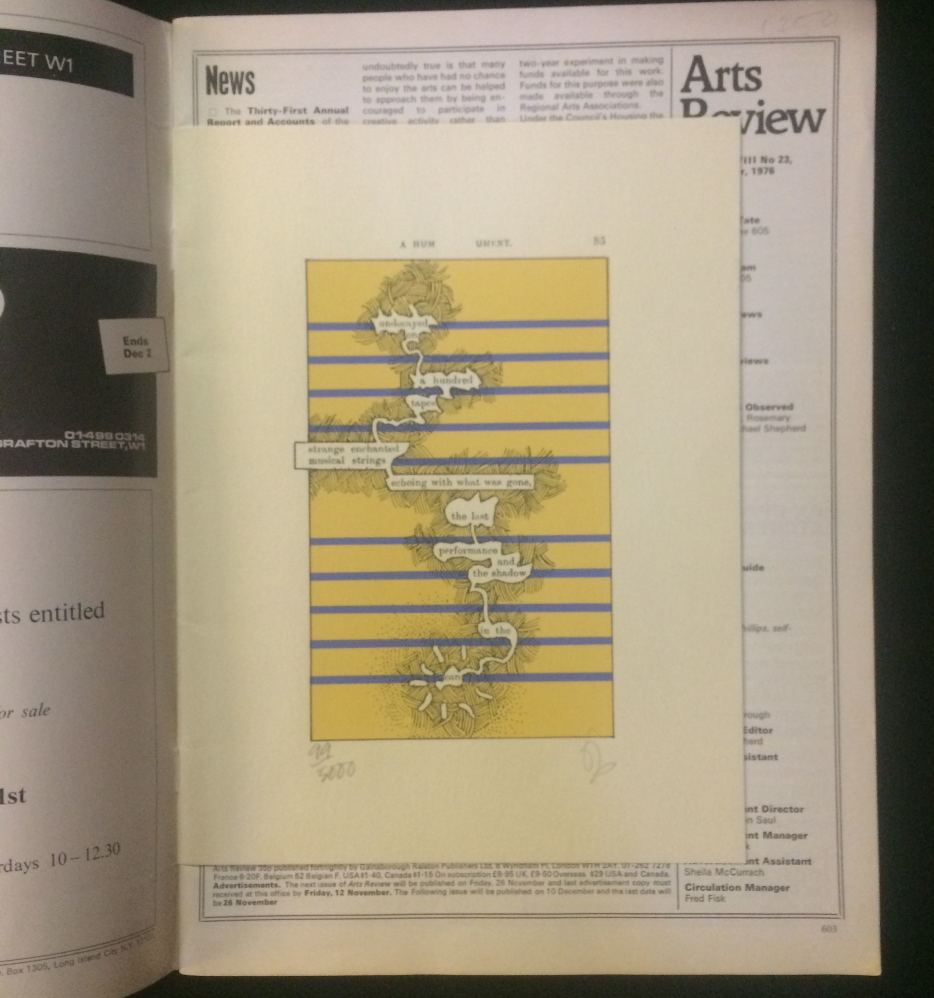 London: Gainsborough Ralston Publishers, 1976. First Edition. Soft cover. Near Fine. Issue dated 12 Nov 1976 the major feature of which is about English artist Tom Phillips and his art. Bound into the spine of this magazine is an original print from the first edition of The Humament, his famous work, this page 85 from it, this copy numbered 99/3000 (or 5000?) by him lower left and initialed by him lower right. Stapled to verso of front cover was double-sided order sheet for Philip's limited edition poster of Yehudi Menuhin for the school which Menuhin founded in Surrey.