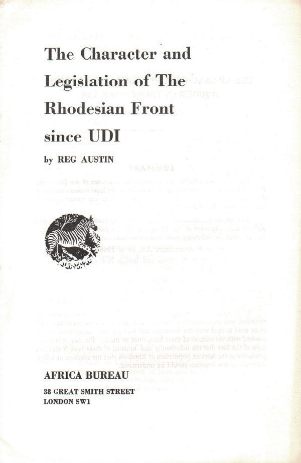London: Africa Bureau, [1968]. First Edition. Octavo (22cm). Printed paper wrappers; 15pp. Minor edge-creasing; Very Good. Examination of the developing character of the Rhodesian Front, with particular attention to the "racialist and authoritarian character of the Rhodesian Front's pattern of government.