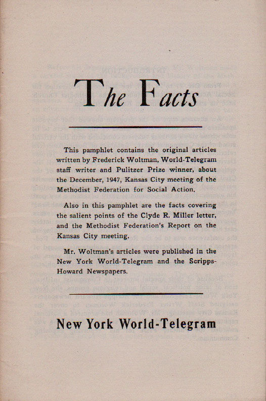 New York: New York World-Telegram, [1948]. Octavo (22cm). Staple-bound pamphlet. Printed paper wrappers; 24pp. Mild creasing and soil; Very Good or better. Reprints Woltman's series of 1947 articles in the Scripps-Howard newspapers exposing supposed Communist infiltration in the Methodist Church, particularly referencing the December, 1947 Conference of the Methodist Federation for Social Action. Not in Seidman; OCLC gives 2 locations (Indiana State, Michigan State).