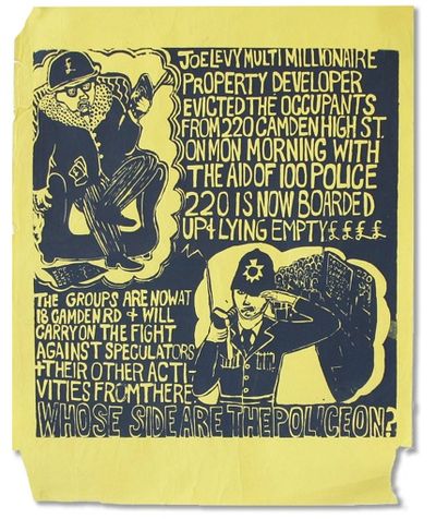 N.p, n.d. [London: All London Squatters, ca 1974?]. Original silkscreened poster, printed in navy blue on yellow stock, measuring 52cm x 65cm (20.5" x 25 5/8"). Edgeworn and creased, with tears at the margins and shallow loss to three of four corners (none affecting image); Very Good. Poster calling attention to the plight of those evicted from the Camden Street Squat, formerly located at 220 Camden High Street. The owner of the building, Joseph Levy (1906-1990), was a wealthy London property developer whose company Stock Conversion helped rebuild the city during the 1950's-60's after WWII. In February 1974, Levy enlisted the help of 100 police officers to evict the occupants of the Camden Street Squat, had the building boarded and locked, leaving numerous families displaced. Levy was despised by the All London Squatters, the group behind Camden Street, and according to their meeting notes (see online resource), plans were in motion to picket both his offices as well as the local courts, though they were ultimately unsuccessful in regaining entry into the squat. A rare poster, not listed in OCLC.