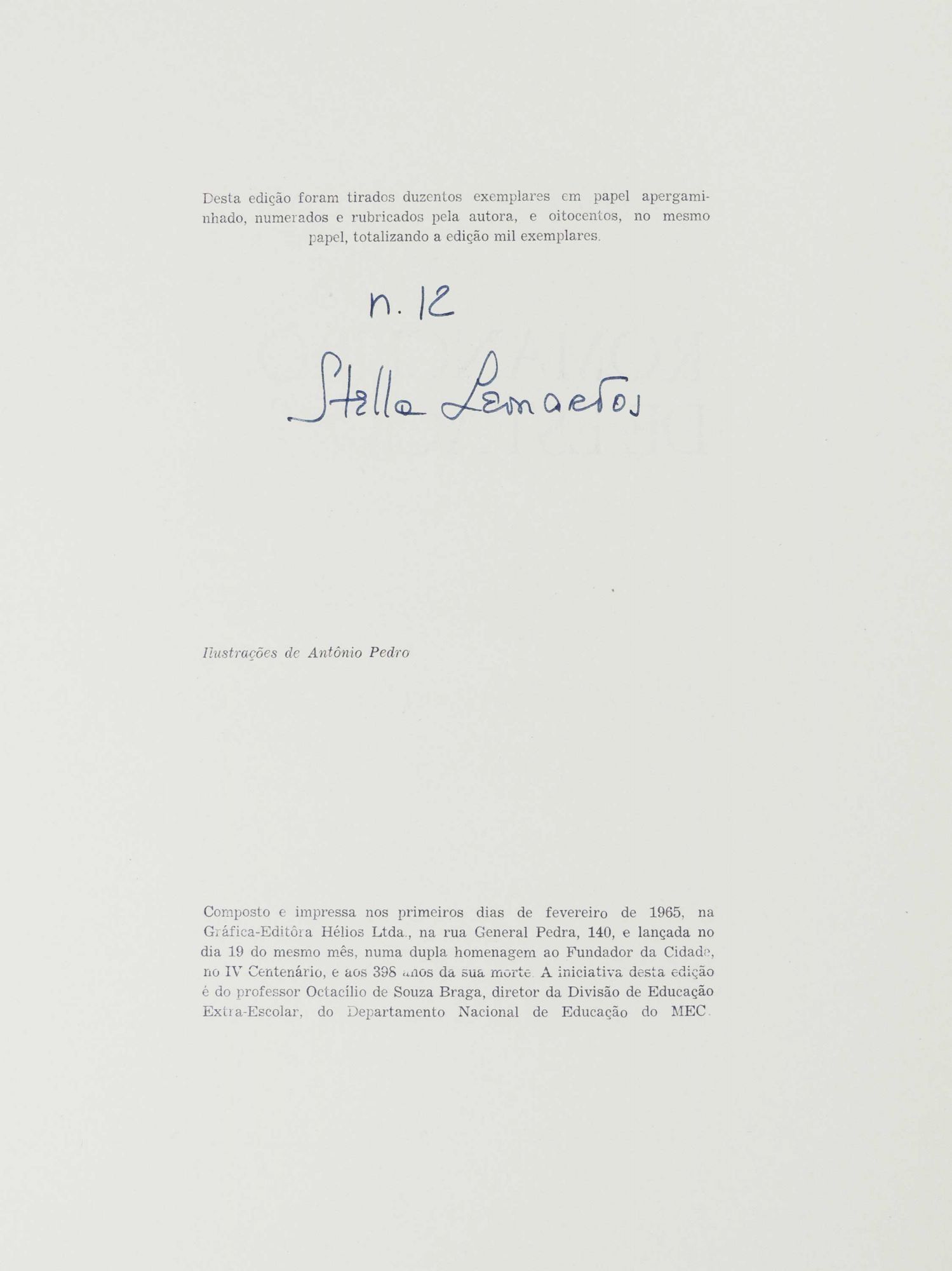 Brazil: Ministerio da Educacao e Cultura, 1965. Paperback. Very Good. Paperback. Number 12 of 200 copies numbered and signed by the author. An additional 800 unsigned copies were printed. Elephant folio. A collection of 50 poems by Stella Leonardos illustrated with 3 lithographs by Pedro. Portuguese author and painter Antonio Pedro (1909 - 1966) helped introduce Surrealism into Portuguese painting during the 1930s. Bound in white and green paper wrappers with green title to front cover. Minor browning to spine and edges of wrappers and a few small closed tears to edges of wrappers. The interior is clean overall with minor browning to edges of pages. Some light foxing / light soiling to margins of some pages. Small closed tear to margin of one of the prints, which does not effect the image. Includes a postcard on the letterhead of the Brazilian minister of education and culture dated 7/6/65 with a brief handwritten note in Portuguese. Unbound as issued in large folded sheets. 91 pages plus plates, notes, and index. IN PORTUGUESE. POE/010715.