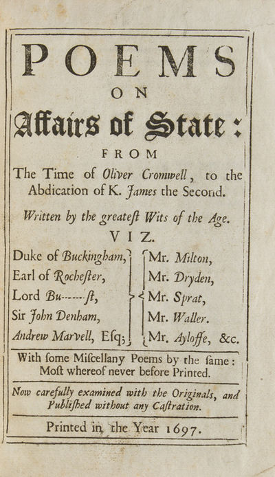 Poems on Affairs of State: from the time of Oliver Cromwell, to the Abdication of K. James the Second. Written by the greatest wits of the age. Viz. Duke of Buckingham, Earl of Rochester, Lord Bu-------st, Sir John Denham, Andrew Marvell, Esq; Mr. Milton, Mr Dryden, Mr. Sprat, Mr. Waller. Mr. Ayloffe, &c. With some miscellany poems by the same: most whereof never before printed. Now carefully examined with the originals, and published without any castration [bound with:] State-poems; continued from the time of O. Cromwell, to the year 1697