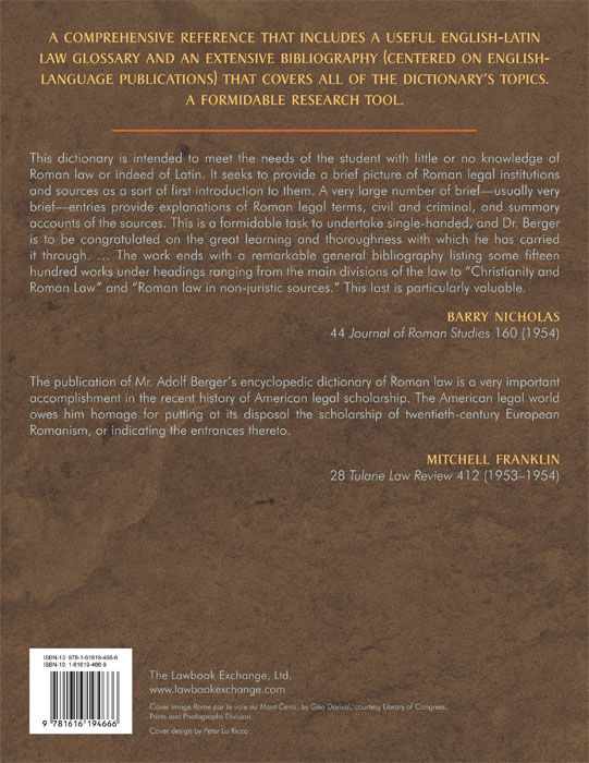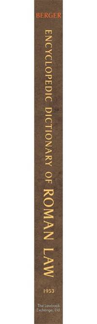 2014. ISBN-13: 9781616194666. ISBN-10: 1616194669. Berger, Adolf. Encyclopedic Dictionary of Roman Law. Originally published: Philadelphia: The American Philosophical Society, [1953]. (Transactions of the American Philosophical Society; New Series, Volume 43, Part 2, 1953). [ii], 333-808 pp. Reprinted 2014 by The Lawbook Exchange, Ltd. ISBN-13: 9781616194666. ISBN-10: 1616194669. 8-1/2" x 11." Paperback. New. $39.95 * A comprehensive reference that includes a useful English-Latin law glossary and an extensive bibliography (centered on English-language publications) that covers all of the dictionary's topics. A formidable research tool. "This dictionary is intended to meet the needs of the student with little or no knowledge of Roman law or indeed of Latin. It seeks to provide a brief picture of Roman legal institutions and sources as a sort of first introduction to them. A very large number of brief-usually very brief-entries provide explanations of Roman legal terms, civil and criminal, and summary accounts of the sources. This is a formidable task to undertake single-handed, and Dr. Berger is to be congratulated on the great learning and thoroughness with which he has carried it through. (...) The extensive bibliographies at the end of each entry of any substance are intended for the advanced reader who will find them invaluable, though sometimes, where the subject covered is wide, he will wish they were classified. (...) The works ends with a remarkable general bibliography listing some fifteen hundred works under headings ranging from the main divisions of the law to 'Christianity and Roman Law' and 'Roman law in non-juristic sources.' This last is particularly valuable." -- Barry Nicholas, 44 Journal of Roman Studies (1954) 160. "The publication of Mr. Adolf Berger's encyclopedic dictionary of Roman law is a very important accomplishment in the recent history of American legal scholarship. The American legal world owes him homage for putting at its disposal the scholarship of twentieth-century European Romanism, or indicating the entrances thereto." -- Mitchell Franklin, 28 Tulane Law Review (1953-1954) 412.