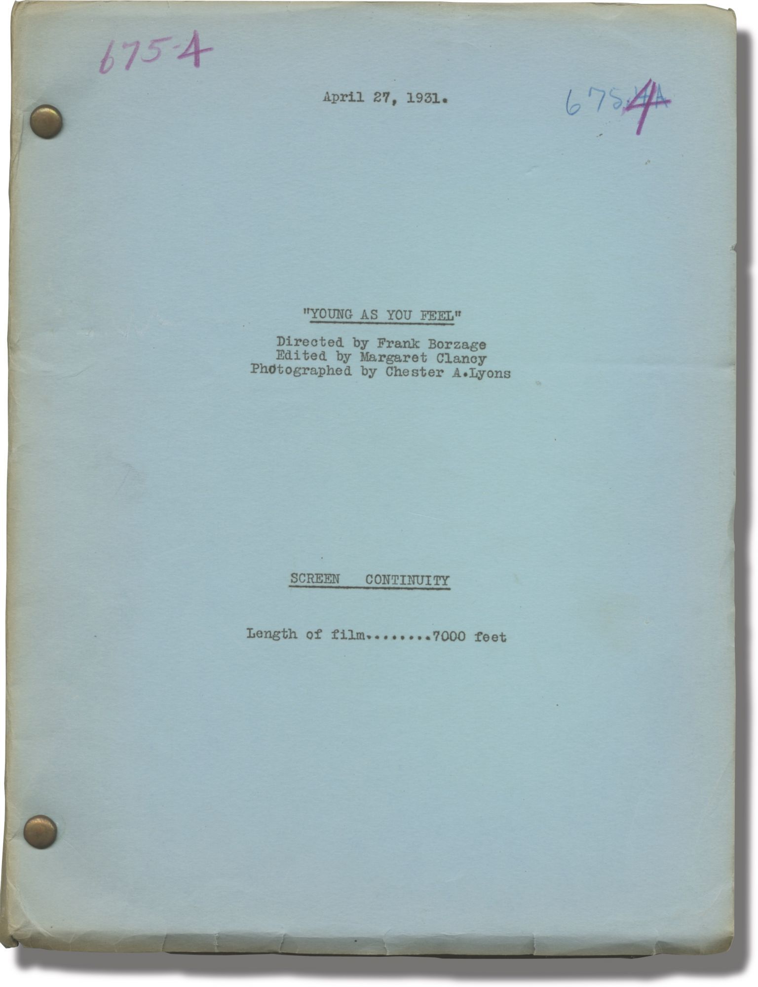 Young as You Feel (Original post-production script for the 1931 film)