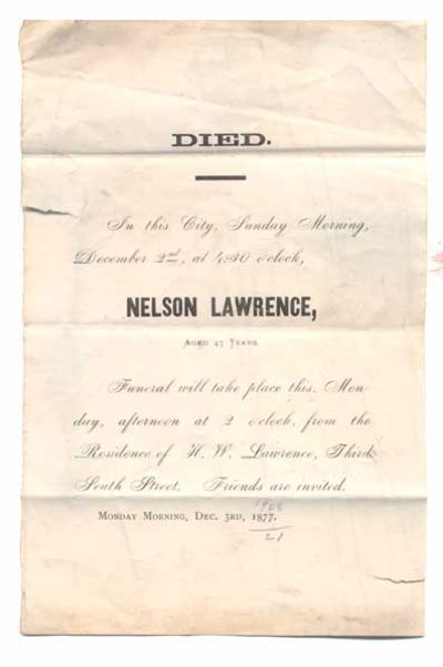 [Salt Lake City], 1877. [20 cm x 13 cm] Eleven lines of text printed in black ink. Minor age toning with two short closed tears and a few small folds. 'Died. In this City, Sunday Morning, December 2nd, at 4:30 o'clock, Nelson Lawrence, Aged 47 Years Funeral will take place this, Monday, afternoon at 2 o'clock, from the Residence of H.W. Lawrence, Third South Street. Friends are invited. Monday Morning, Dec. 3rd, 1877.'. "Deceased had long been a resident of this territory, the later years of his life being passed in Ophir, where he was engaged in mercantile business, and in this city. He was a genial, intelligent gentleman and was universally esteemed and respected by his large circle of friends and acquaintances. He leaves a wife and three children, besides numerous relatives and friends." - Salt Lake Herald 12/4/1877.