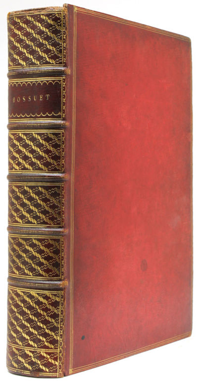 Paris: Didot, 1784. One of 200 copies on papier vélin. [iv], 629, [3] pp. 4to. Contemporary red morocco, covers with ruled in gilt with triple fillet border, spine with 5 raised bands, titled in gilt in one, the rest gilt all over with a repeating lightning bolt or staircase pattern, a.e.g., gilt turn-ins, marbled endpapers, by Derôme the younger (with his ticket to first blank). Wear to head of spine, some sporadic spotting to text. One of 200 copies on papier vélin. [iv], 629, [3] pp. 4to. One in a series of works of French and Latin literature printed by Didot and originally published in 1681 by the order of Louis XIV for the education of the Dauphin. Boussuet’s history was the last in a long line of universal histories, from St. Augustine onwards, that interpreted history as the continuing manifestation of divine providence. This copy finely bound by Derome the younger, with his ticket, and tooled on the spine with a distinctive staircase or lightning bolt tool. Cf. PMM 157 (for original edition)