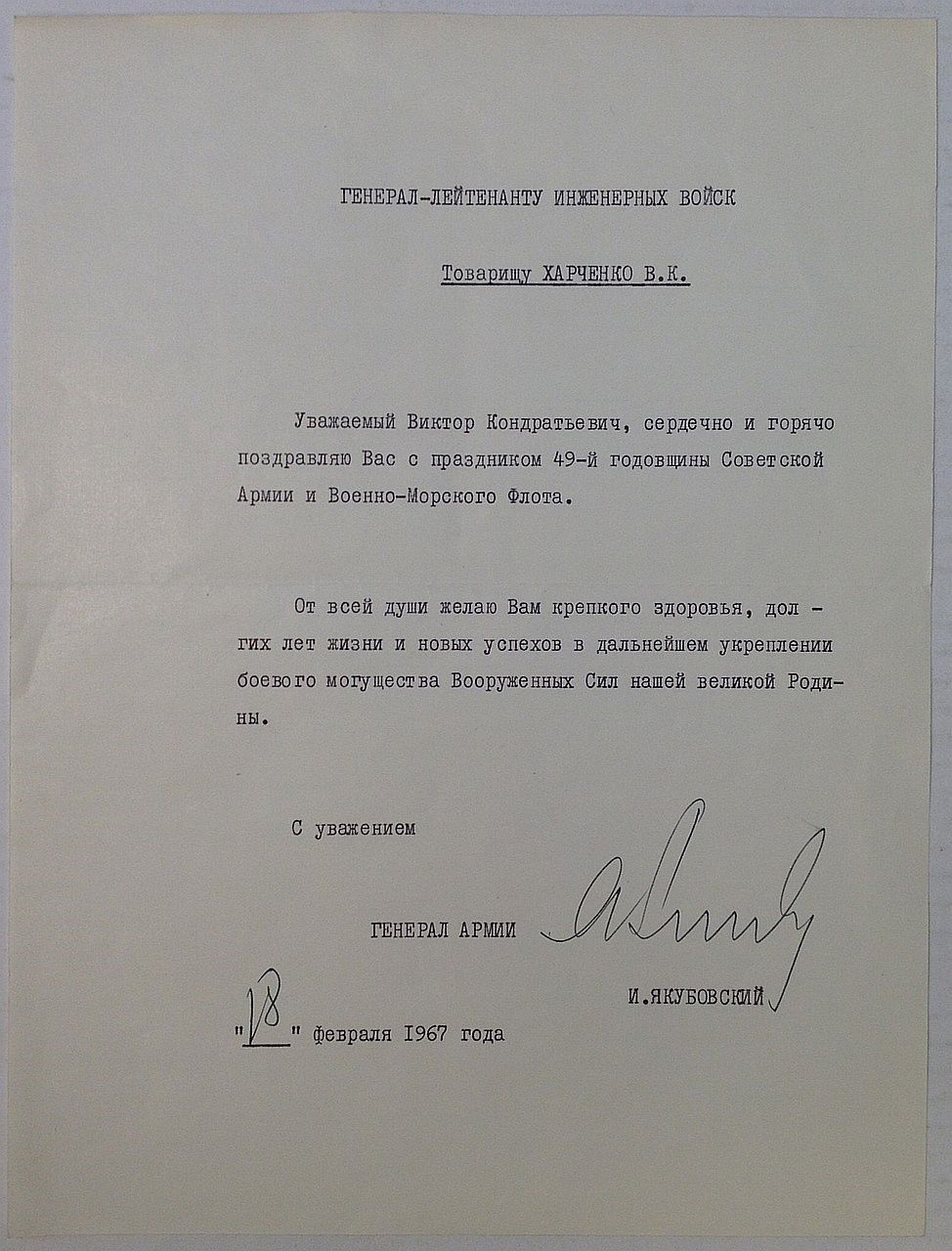 1967. unbound. 1 page, 11 x 8.25 inches, October 18, 1967. This proclamation, honoring of the 49th Anniversary of the Soviet Army and Navy, was sent to a colleague in the Soviet Military. One horizontal fold; near fine condition.