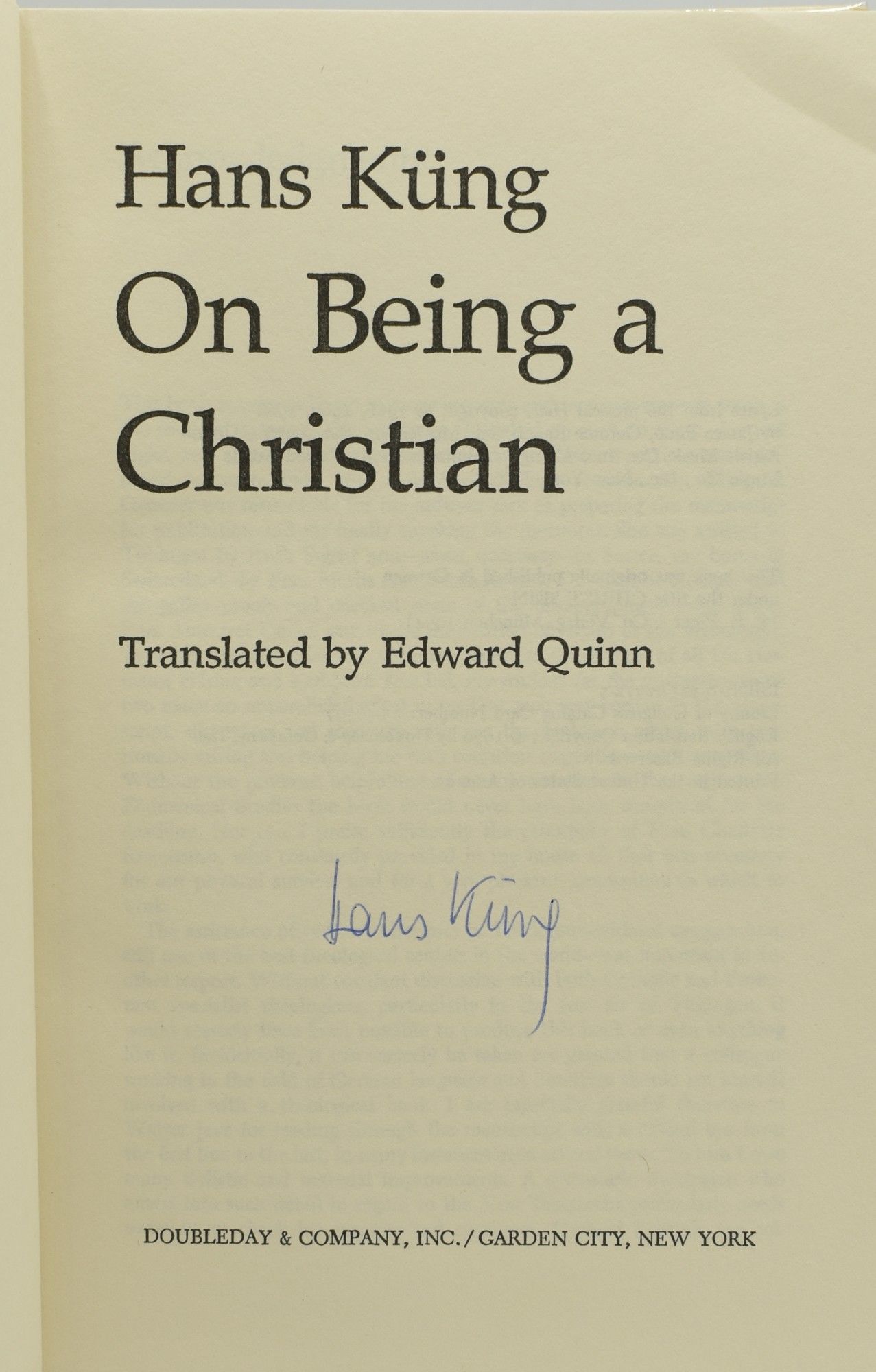 New York: Doubleday, 1978. Hard Cover. Very Good binding/Very Good dust jacket. This copy of Kung's monumental work is Signed by Hans Kung on the title page. There are occasional pencil marks in the text. The dustjacket is now protected with a new mylar cover. Very Good binding / Very Good dust jacket.