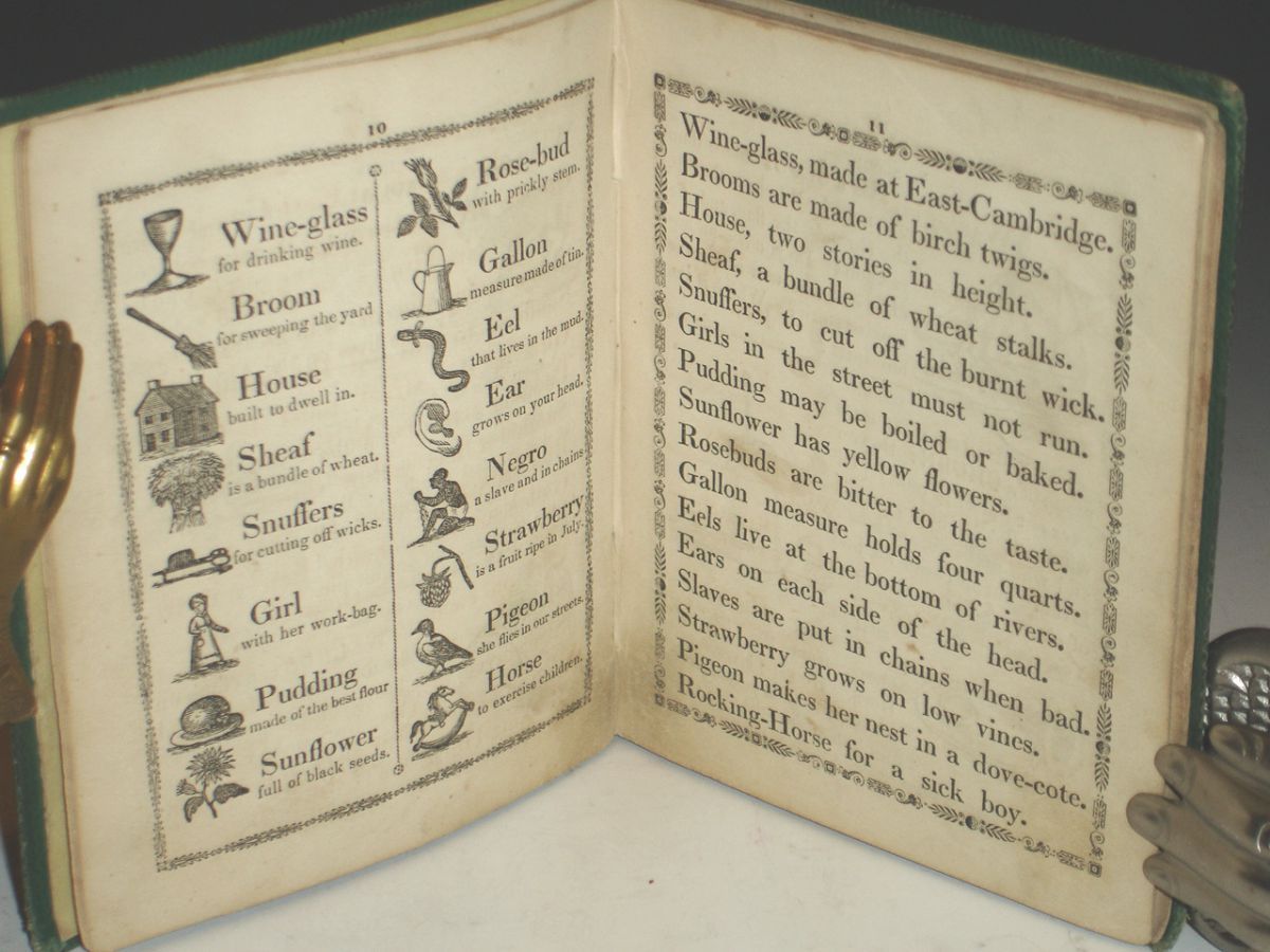 New York: (1830): Blakeman & Mason. 16mo. 64pp. Child's learning book describing and discussing all kinds of objects, each with an attractive woodcut drawing. Bound in green embossed cloth, spine plain, yellow endpapers, occasional spots of foxing or staining, short closed tear to outer margin of page 51Attractive pages with an occasional stain spot. Previous owner's gift inscription in pencil. A good copy.