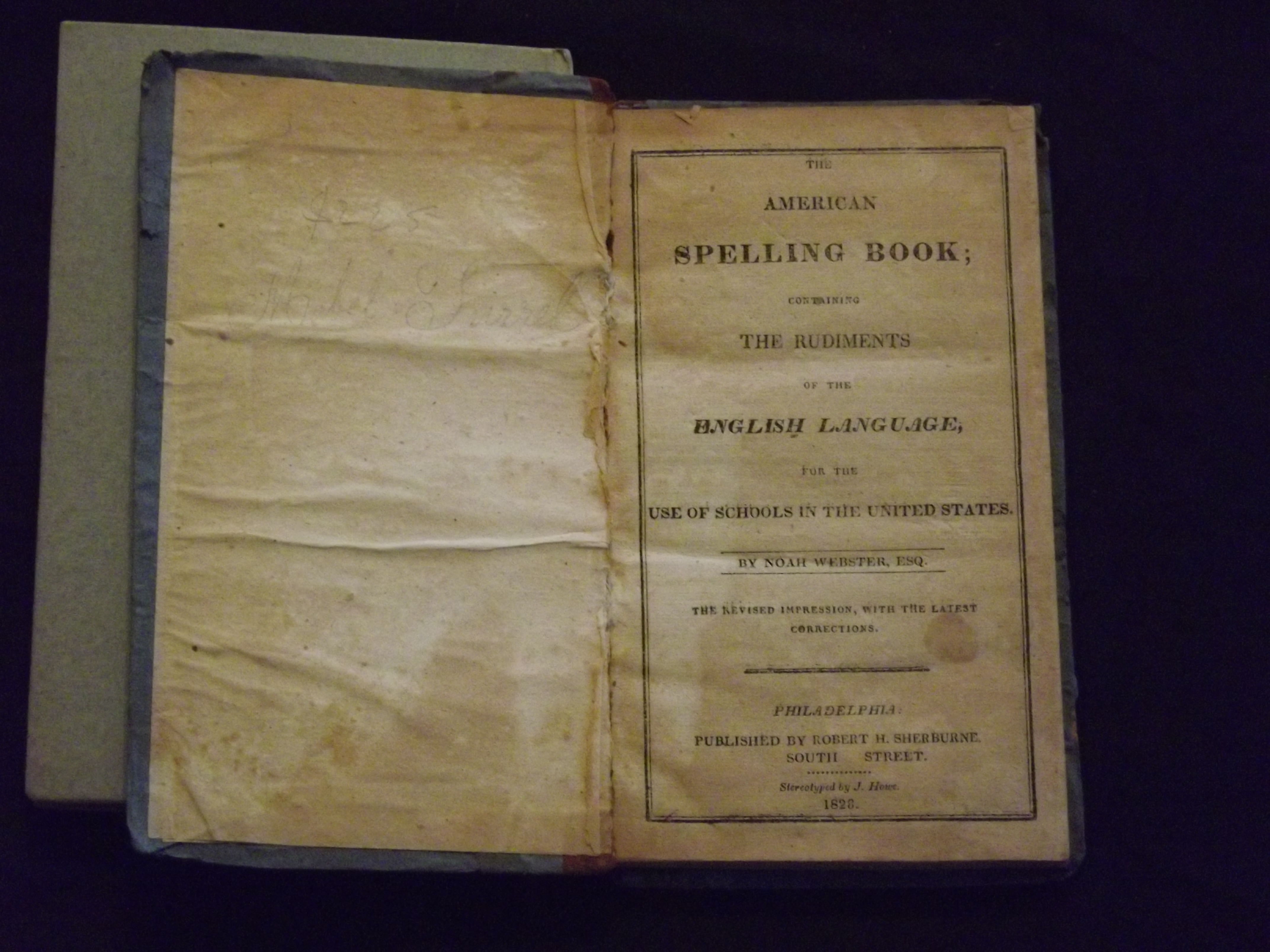 Small 8vo, leather spine, cloth with cardboard covers, 168 pp. Spine ends chipped and worn, front joint cracked and tender, corners showing, covers a little warped, some aging, browning, and staining, but internally in very good condition. Noah Webster (1758-1843) first introduced his spelling book in 1783, and it would become the basic schoolbook for children in early 19th century America. Revised many times by Webster, it would teach generations of Americans how to read and spell.