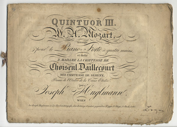 Quintuor III ... arrangé pour le Piano=Forte à quatre mains et dedié à Madame la la Comtesse de Choiseul Daillecourt née Comtesse de Sérény, Dame de l'Ordre de la Croix Etoilée, [KV 406]