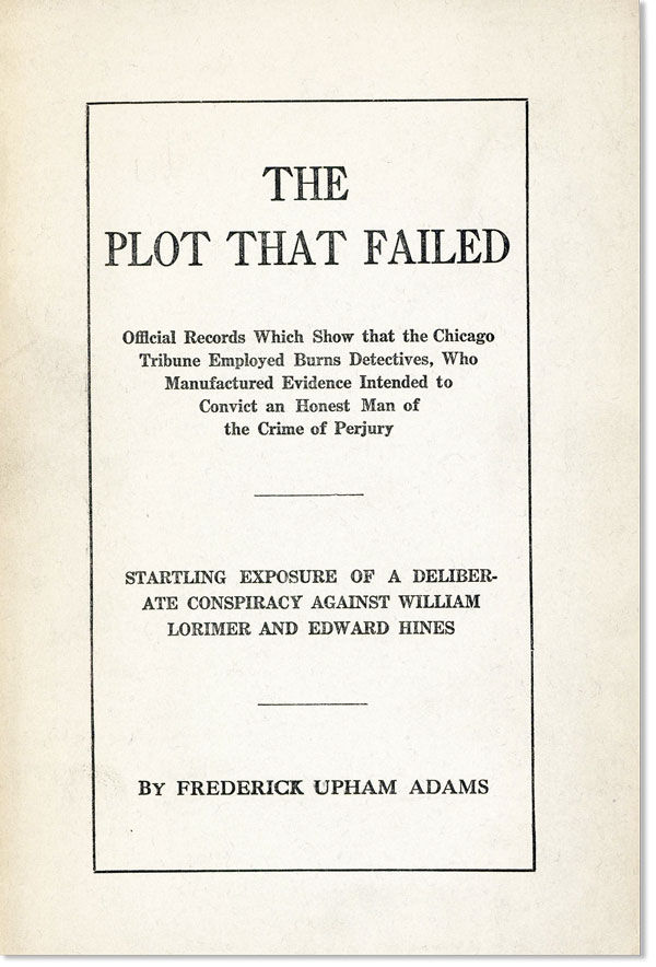 [Hasting-on-Hudson, N.Y.: Frederick Upham Adams, ca. 1912]. First Edition. Octavo (22.75cm.); original grey printed staplebound wrappers; 24pp. Wrapper edges a bit toned, else about Fine. WITH the rather elusive large bifolium insert to accompany p. 19 of the pamphlet. Insert with clean tears from previous folds affecting text without loss of meaning. Insert provides several "Tests" and reproduces manuscript documents to show the "Dramatic Collapse of a Plot Which Disgraces American Journalism." William Lorimer was a United States Senator from Illinois from 1909 to 1912, when the Senate held his election as invalid due to corrupt methods, including buying votes, to win the election. Adams' exposé did not have the intended effect; Lorimer ended his career in the lumber industry rather than the House of Representatives.