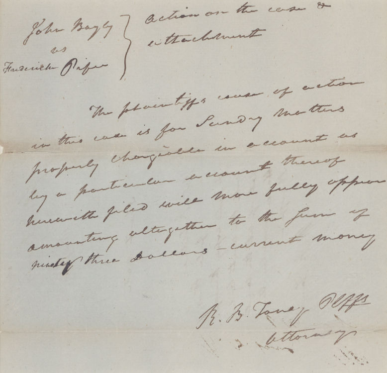 Autograph Manuscript, signed (“R.B. Taney”), as attorney for the plaintiff in the case of John Bayly vs. Frederick Pifer