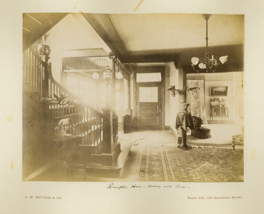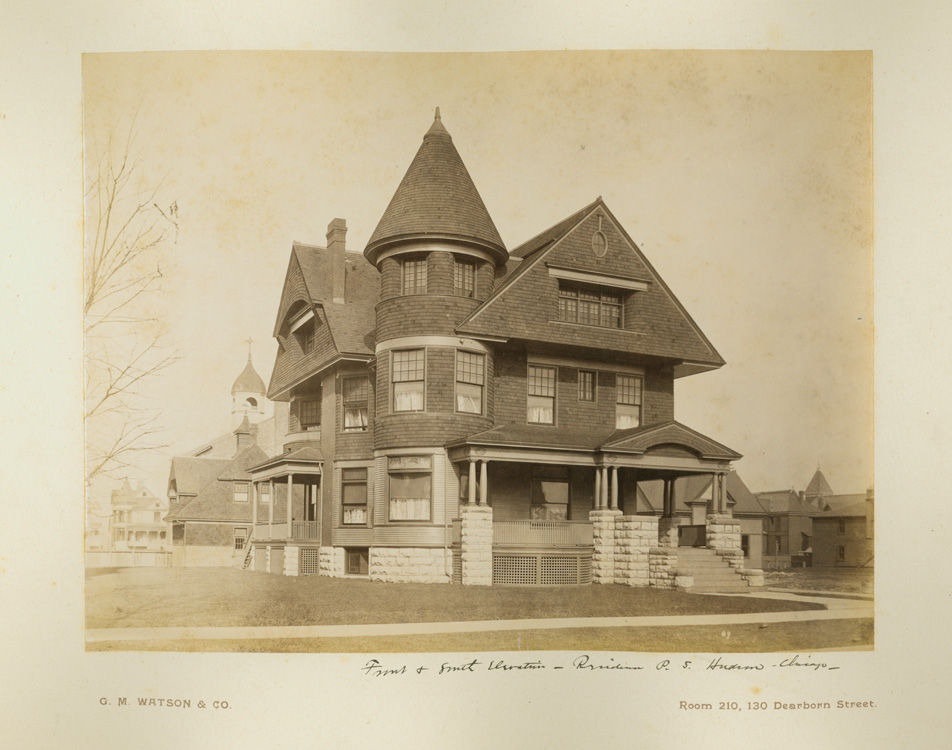 Room 210, 130 Dearborn Street [Chicago]: G.M Watson & Co, 1880. 10 vintage albumen prints mounted on card, captioned in pen. 7-1/4 x 9-1/2 in. Some fading to images and foxing and warping to mounts. 10 vintage albumen prints mounted on card, captioned in pen. 7-1/4 x 9-1/2 in. 10 vintage photographs of the shingle-style home of one P.S. Hudson of Chicago, with two views of the exterior and 8 interior views of the library, parlor, dinning room, music room, etc.