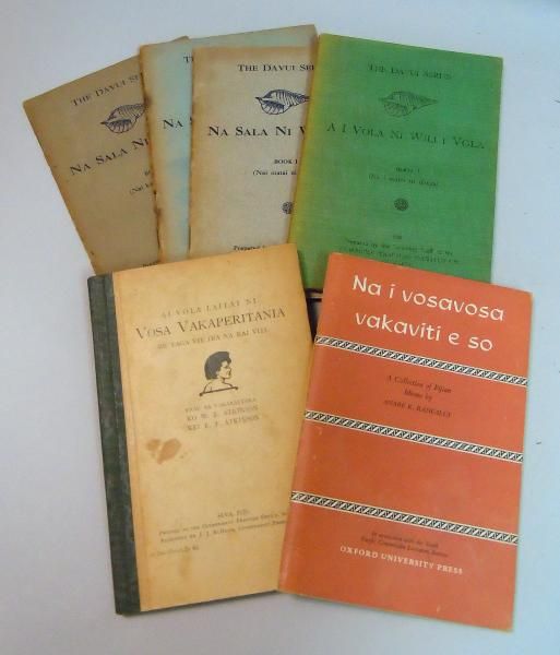 Mixed; well read. Twenty (20) different titles from the estate of Clellan S. Ford, an American anthropologist, best known as Professor of Anthropology at Yale University. Ford spent a year in the Fiji Islands conducting ethnographic field research. He then joined the Institute of Human Relations at Yale, where he co-founded the cross-cultural Survey. The titles include Flight of the Chiefs, Epic Poetry of Fiji, 1942; A History of Fiji, Volume One, 1957; A Vagabond in Fiji, 1927; Fijian Grammar, 1946; Ai Vola Ni Sere ni Lotu Weselle e Viti, Fijian Hymn Book, 1933; The Song of Milkanwatha: Translated from the Original Feejee, 1856; Cannibal Islands (lacking title page, disbound, etc), n.d.; Na i vosavosa vakaviti e so, 1954; Ai vola lailai ni vosa vakaperitania me yaga vie ira na kai viti, 1932; The Davui Series including A I vola ni wili I vola, Book I, 1926; Na Sala Ni Wilivola, Book 1 and Book 2, n.d.; A I vola ni wili i vola, 1926. Also includes A New Fijian Grammar, 1941; An English-Fijian Medical Vocabulary, 1927; A Guide to Pacific Island Dietaries, 1947; Handbook of Fijian Language, 1936; Tales from the South Seas, 1953; Fiji in Picture, 1972 and Murder in Fiji; 1945. A mixture of hard cover and paperback. .