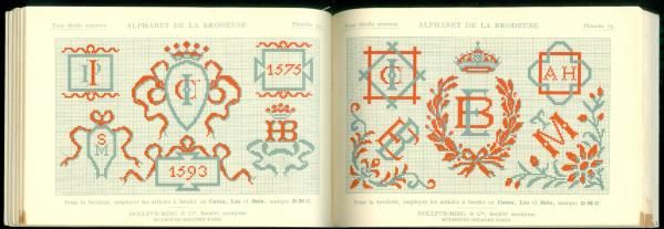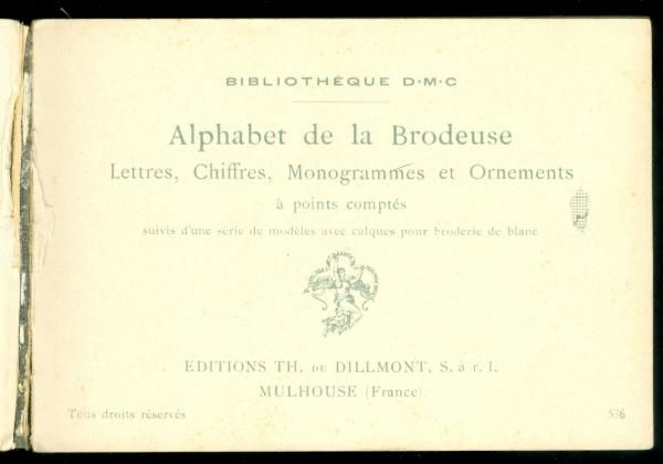 France: Dollfus-Mieg & Cie. Editions th. de Dilmont, S.a. r. l.. clear tape repair on back strip.. Unpaginated hard cover with 91 alphabet and other decorative pattern plates, over eight in three color. Also includes ten perforated removable plates for transfer. This is followed by approximately fifty pages of narrative with images from photographs of completed works and more. Paper separation inside cover where paper meets back strip. Small area of paper lose on title page. Measures 6 1/4" x 4".