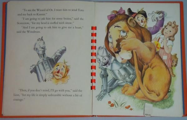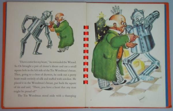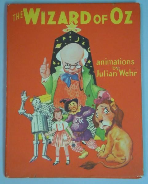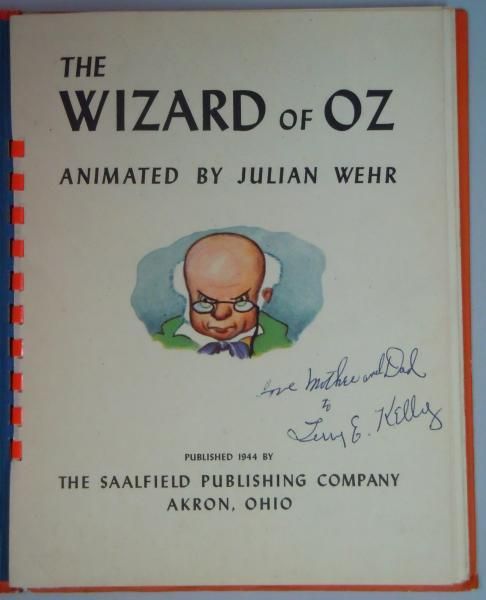 Akron, OH: Saalfield, 1944. 12 pp. paper covered board spiral comb bone book. Excerpt from the original story by L. Frank Baum. Created and Produced by the Duenewald Printing Corp., New York. Sole Agent for Wehr Animation. Includes six (6) movable pages--when tab is slid to and fro, three-animations move. Charming imagery as when the wizard is filling the scarecrows head with "bran brain"...Nice copy with strong color. Some corner and edge wear. Light wrinkling on tabs from use. Measures 6 3/4" x 9